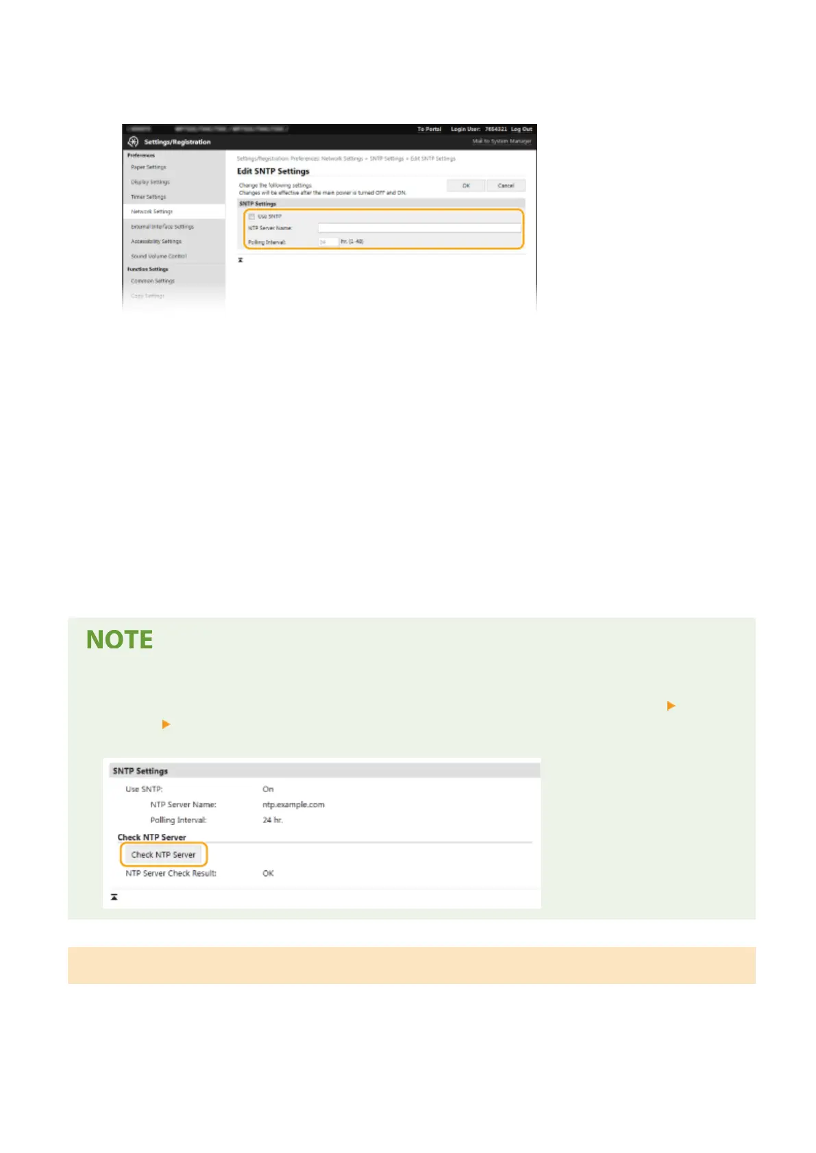 Settings] [Check NTP Server] in [SNTP Settings]. If a proper connection has been established, the result is