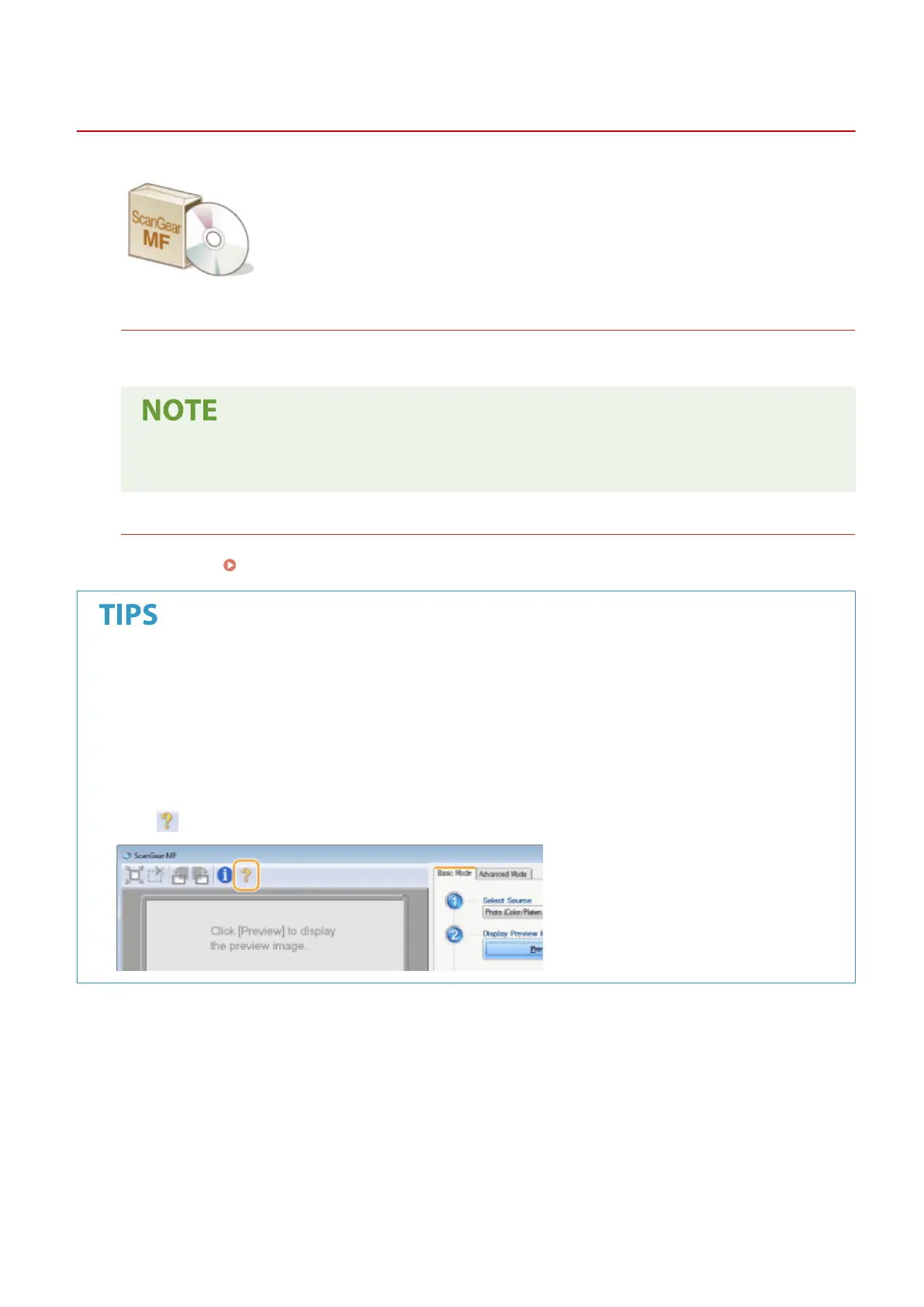 When scanning from MF Scan Utility, click [ScanGear] to start ScanGear MF. For more information, click