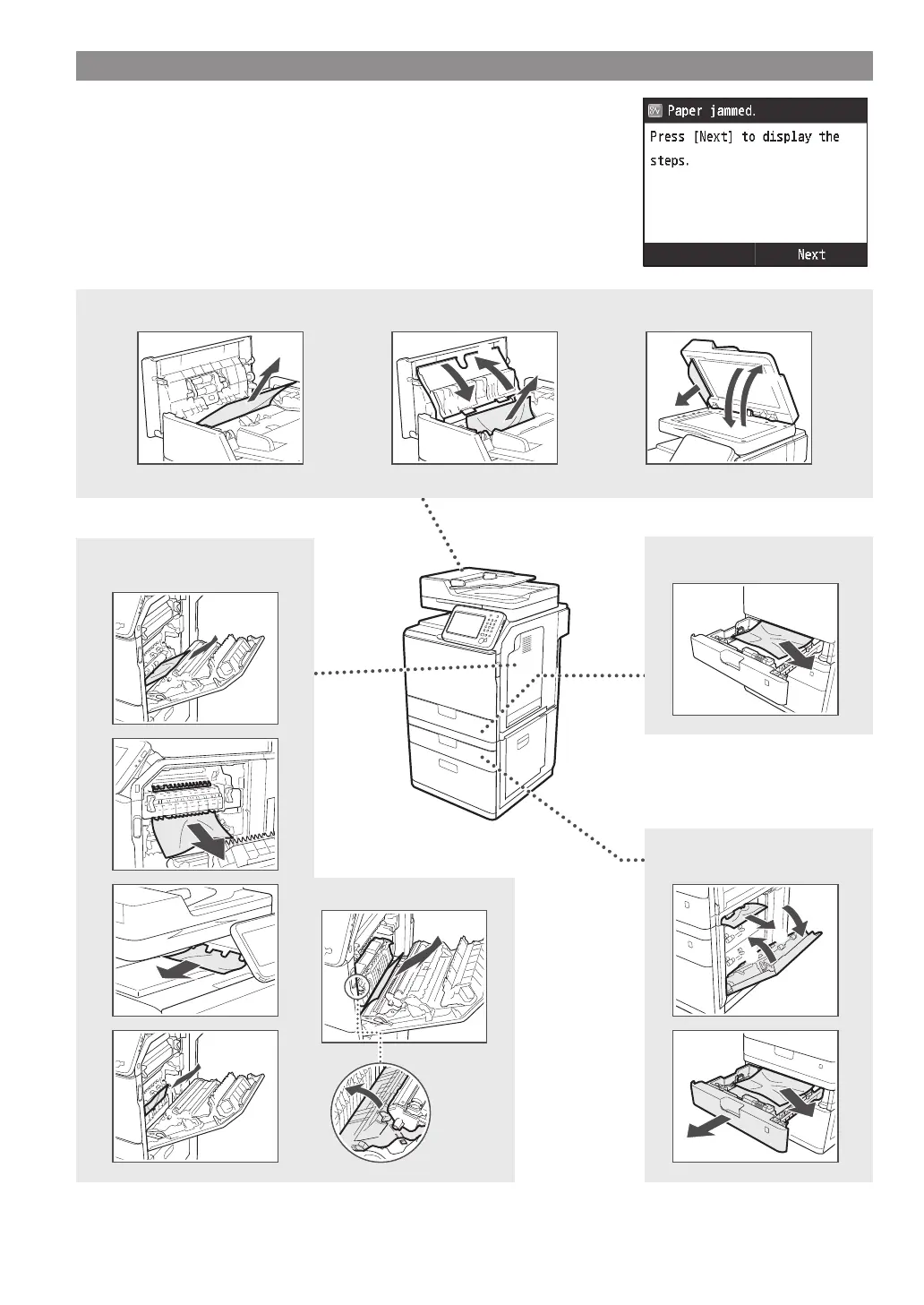 document or paper. This manual indicates only areas where paper jams occur. For details