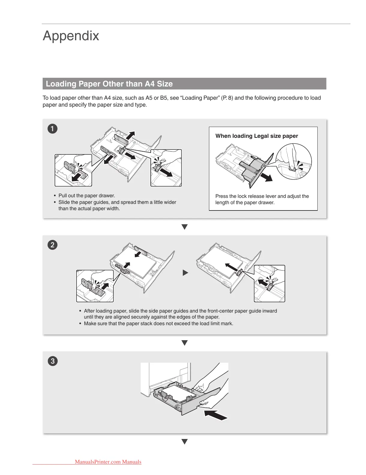 To load paper other than A4 size, such as A5 or B5, see “Loading Paper” (P. 8) and the following procedure to load