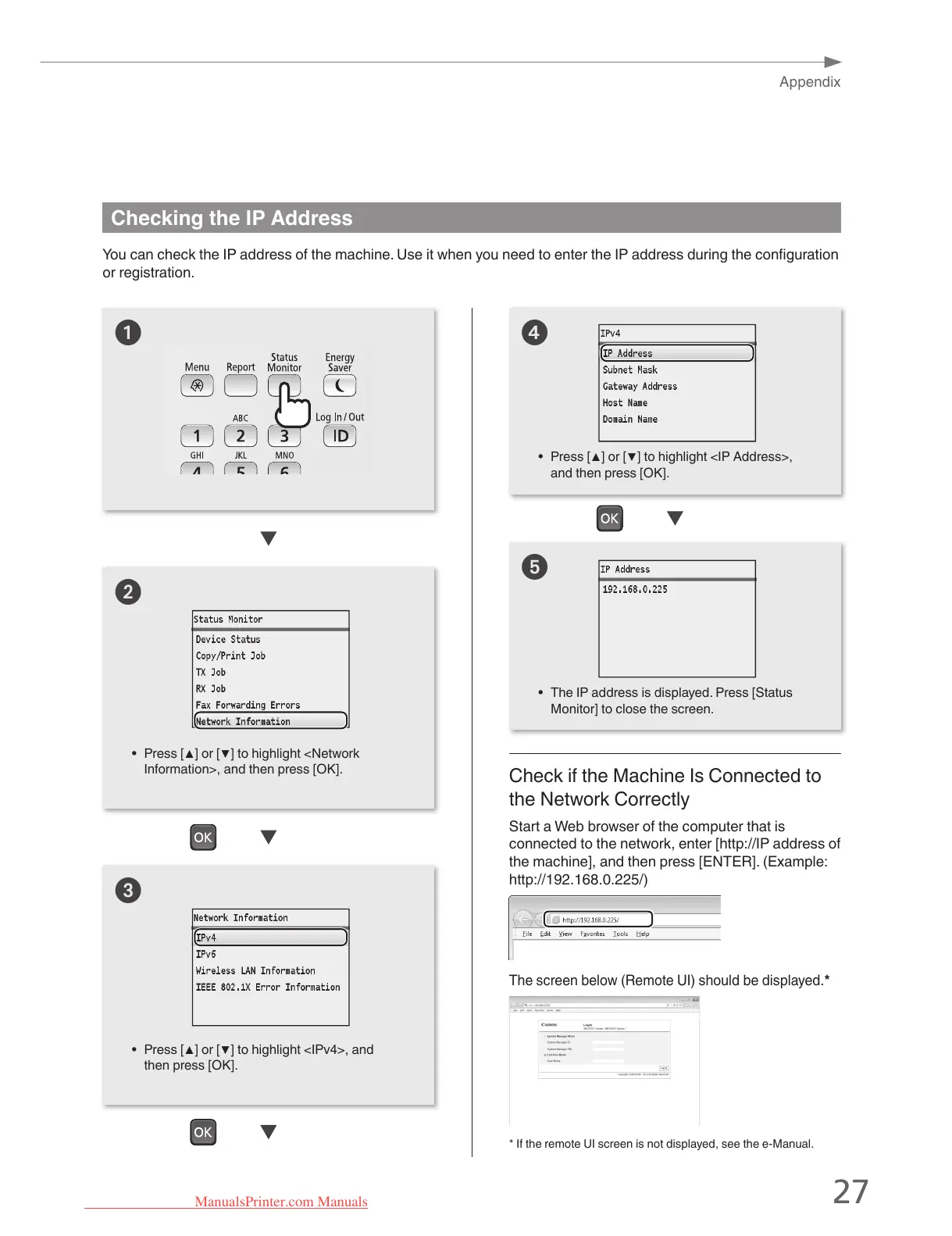 You can check the IP address of the machine. Use it when you need to enter the IP address during the conguration