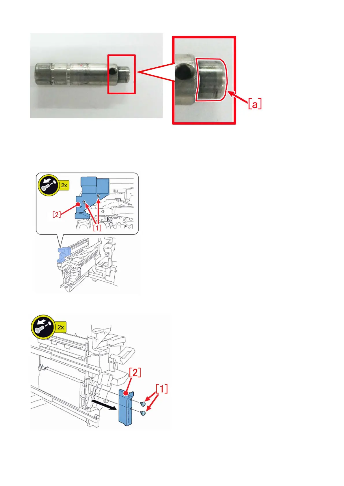 b-1) Remove the 2 screws [1] and remove the delivery reverse cover 1 [2].