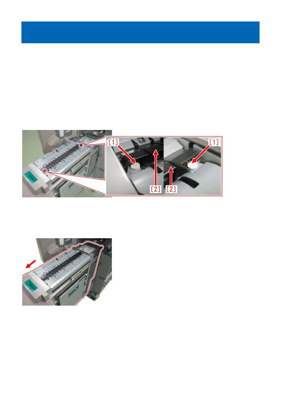 2) Press the folding/straight flapper [1] lightly with a finger and check if it is stuck to the spacer [2]. If the folding/straight