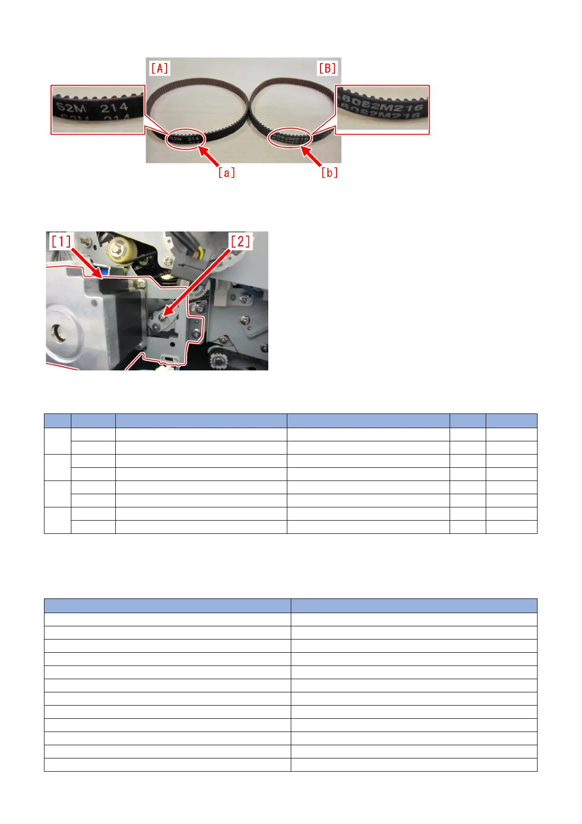 5) Loosen the screw [2] on the tensioner plate of the paper delivery drive assembly (L) [1]. (By loosening the screw, tension is