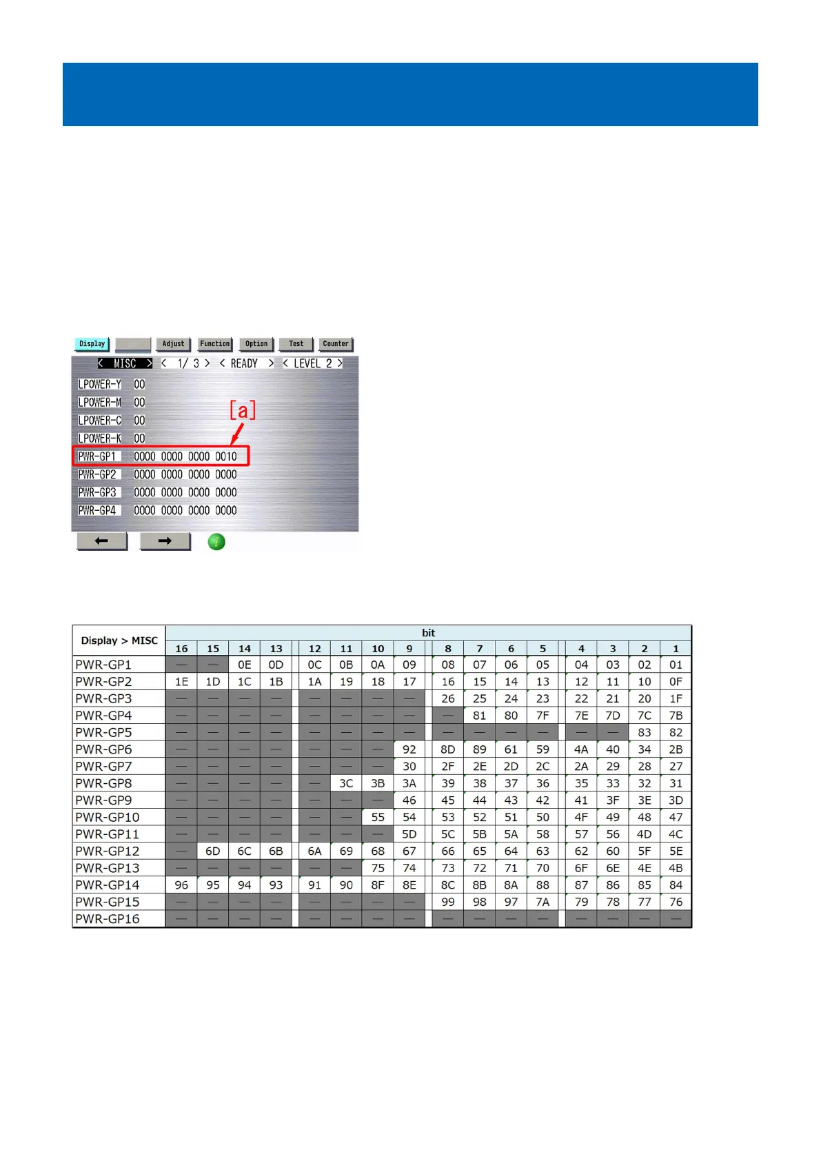 1) Check the bit display of Service Mode (Level 2) > Mode List > COPIER > Display > MISC > [PWR-GP1] to [PWR- GP16]. The