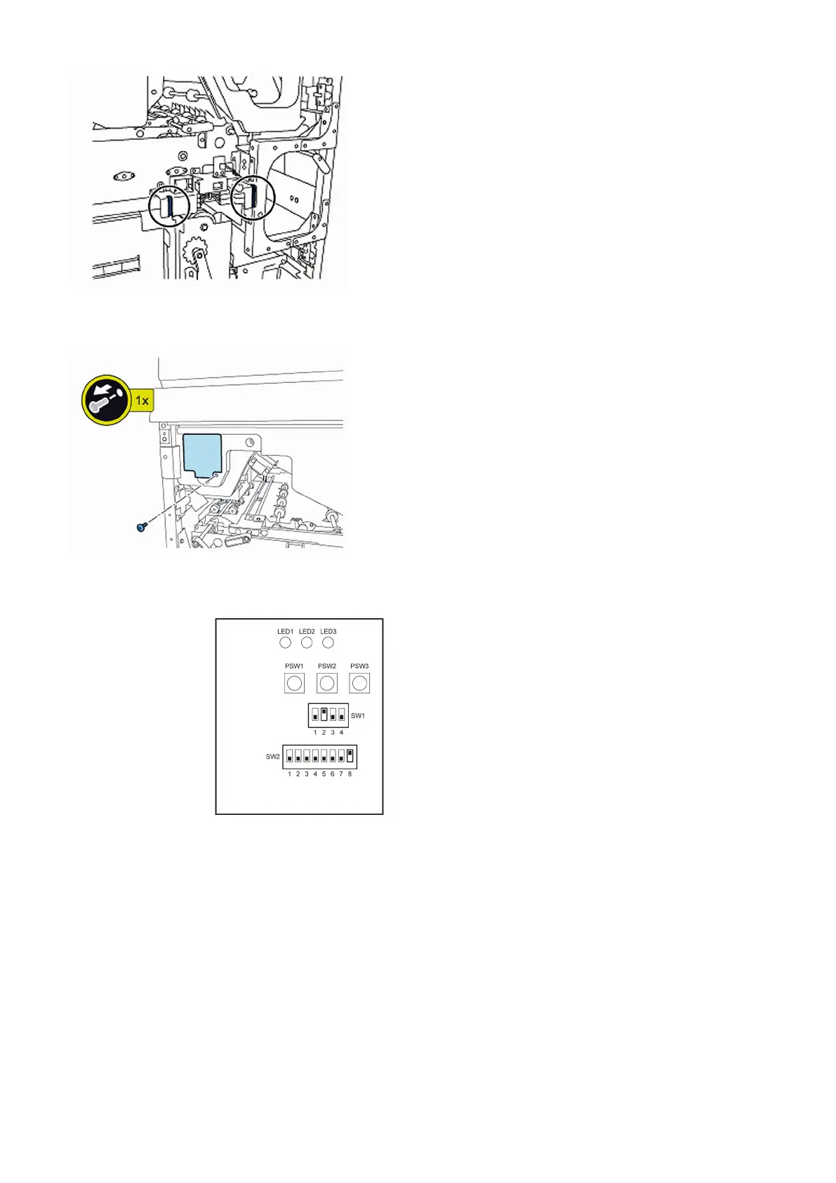 5) Turn on SW1-2 and SW2-8 on the service PCB and set the machine in service mode.