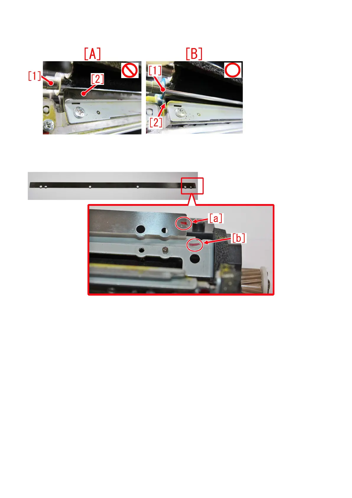 - After the installation of bias roller/bias roller 2 [1] in step7), check and confirm that the scraper sheet [2] is not turned up. [A] is