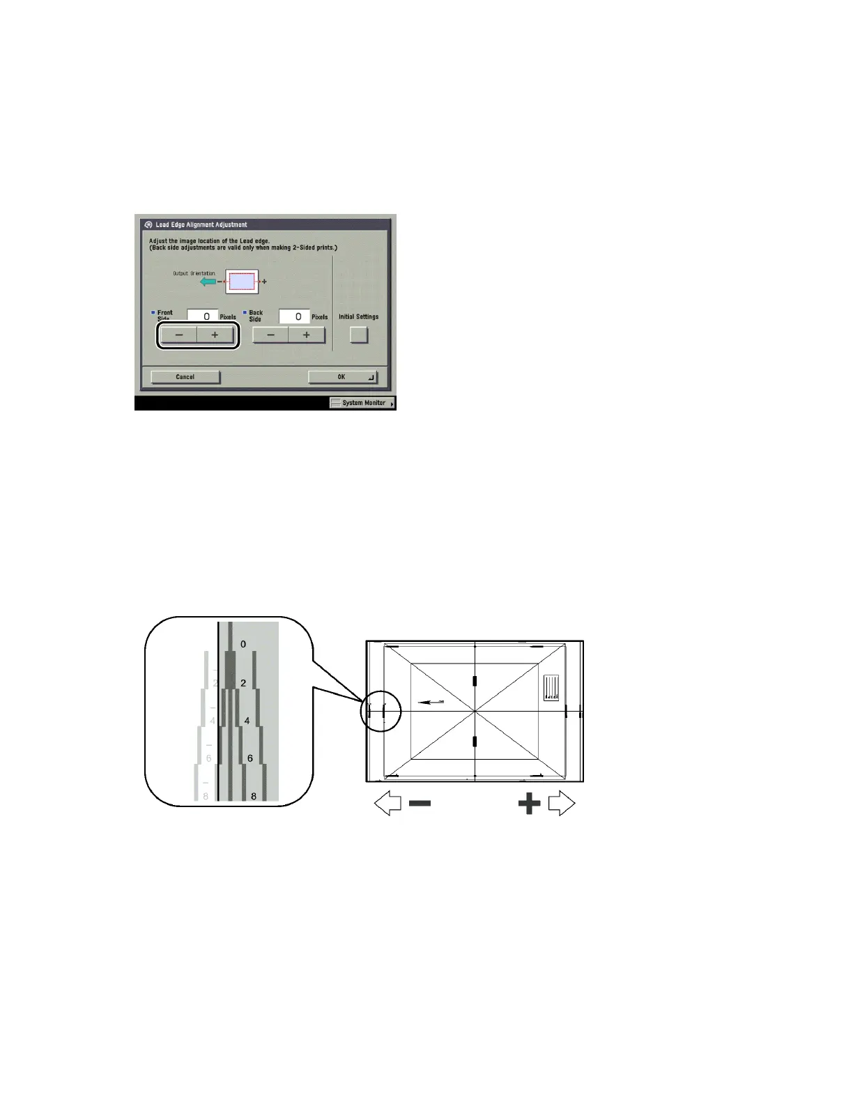 8 Press [-] or [+] for <Front Side> to input the number of pixels to shift the image.