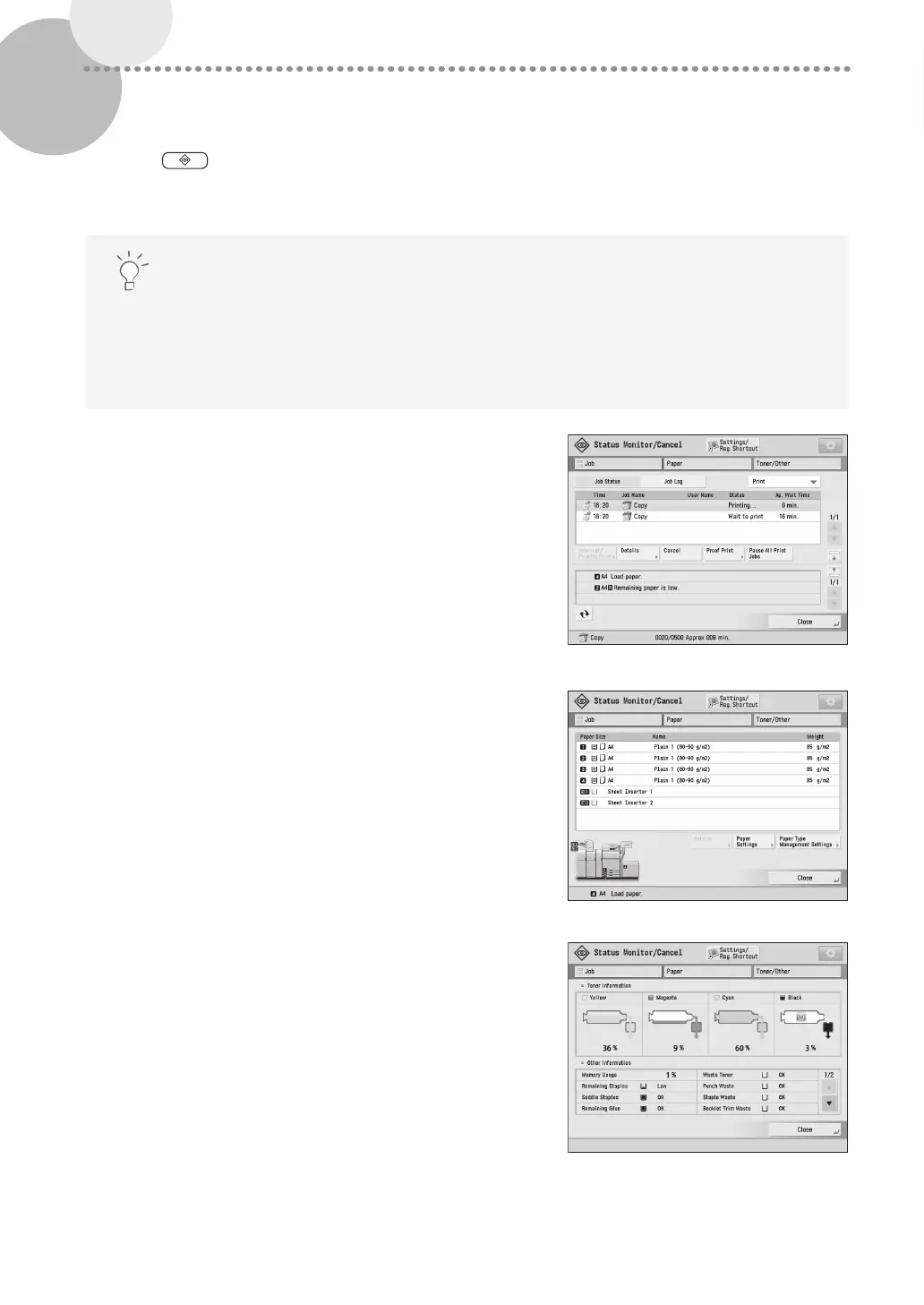 consumables on this screen. By obtaining information, such as the completion time of the current job or the amount