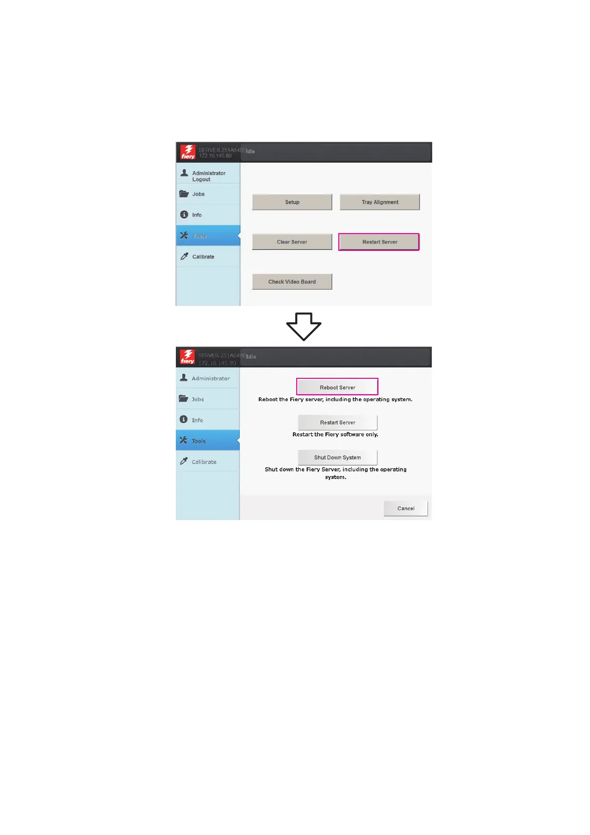 3. From the printer touch panel, select Fiery > Tools > Reboot Server.