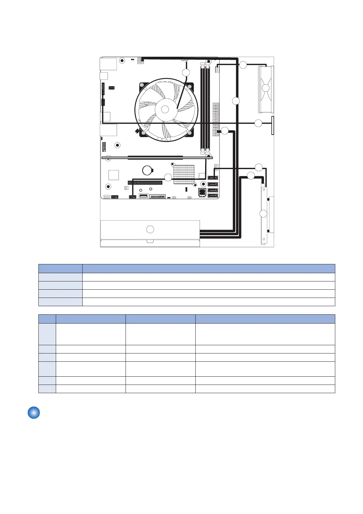 The following diagrams illustrate the internal cable connections between hardware components and the motherboard.