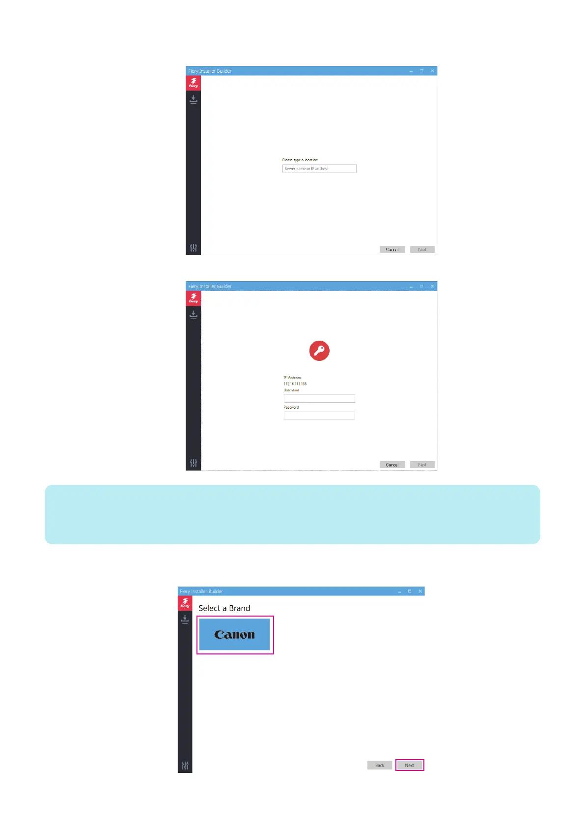 1. At the Please type a location prompt, enter the name or IP address of the imagePRESS Server, and click Next.