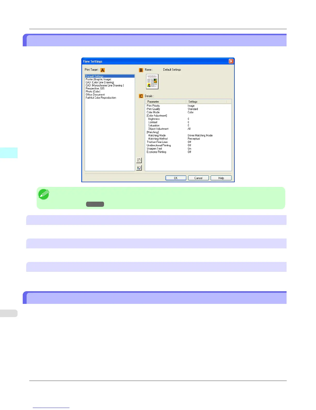 Here, you can confirm detailed settings values for each listed item for the selected Print Target.
