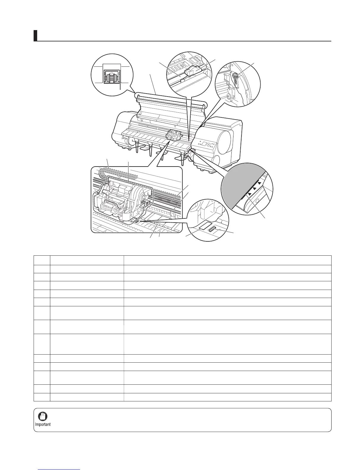Do not touch the Linear Scale (k), Carriage Shaft (d), or Ink Tube Stabilizer (m). Touching these parts may