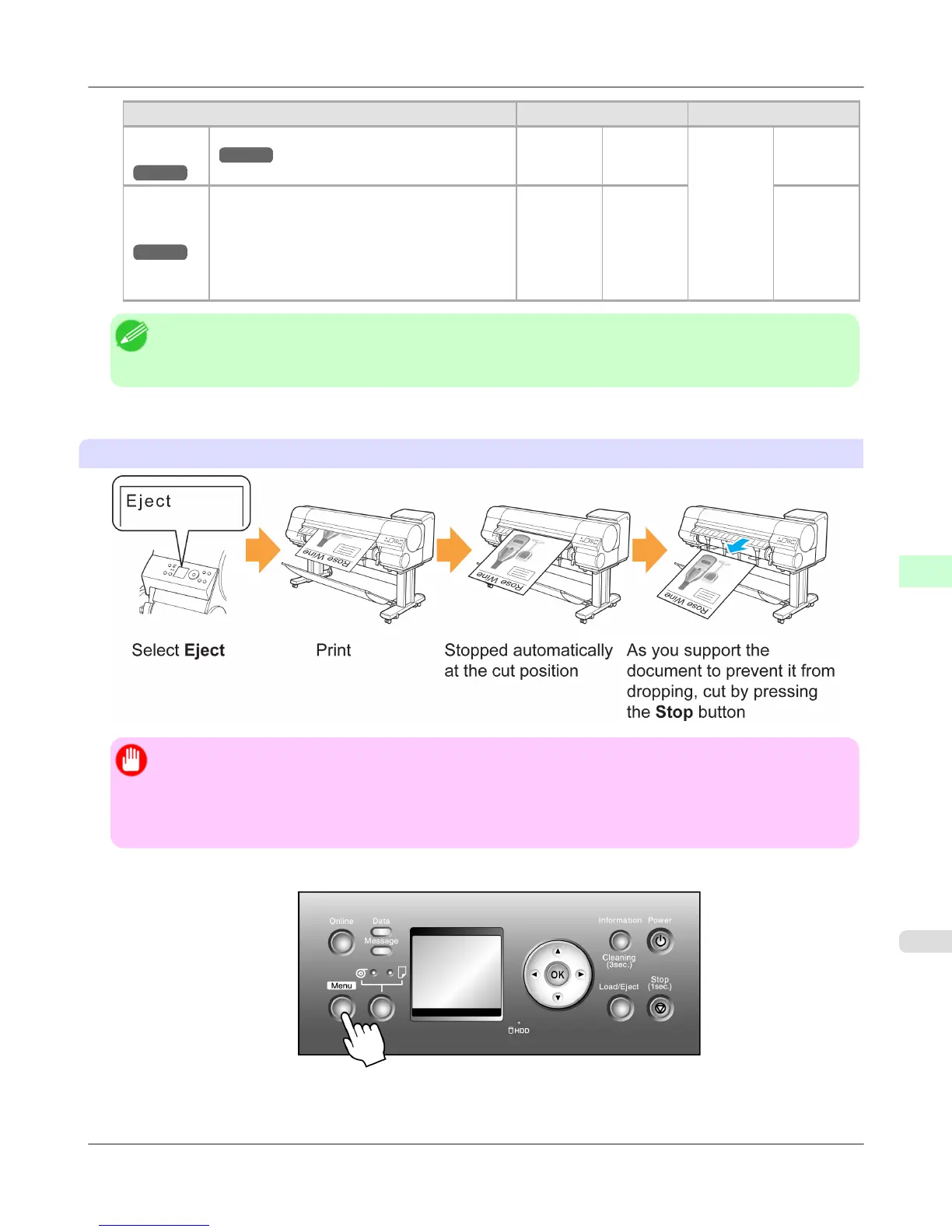 • With Eject, printing does not resume after a series of jobs have been printed continuously until the roll is cut.