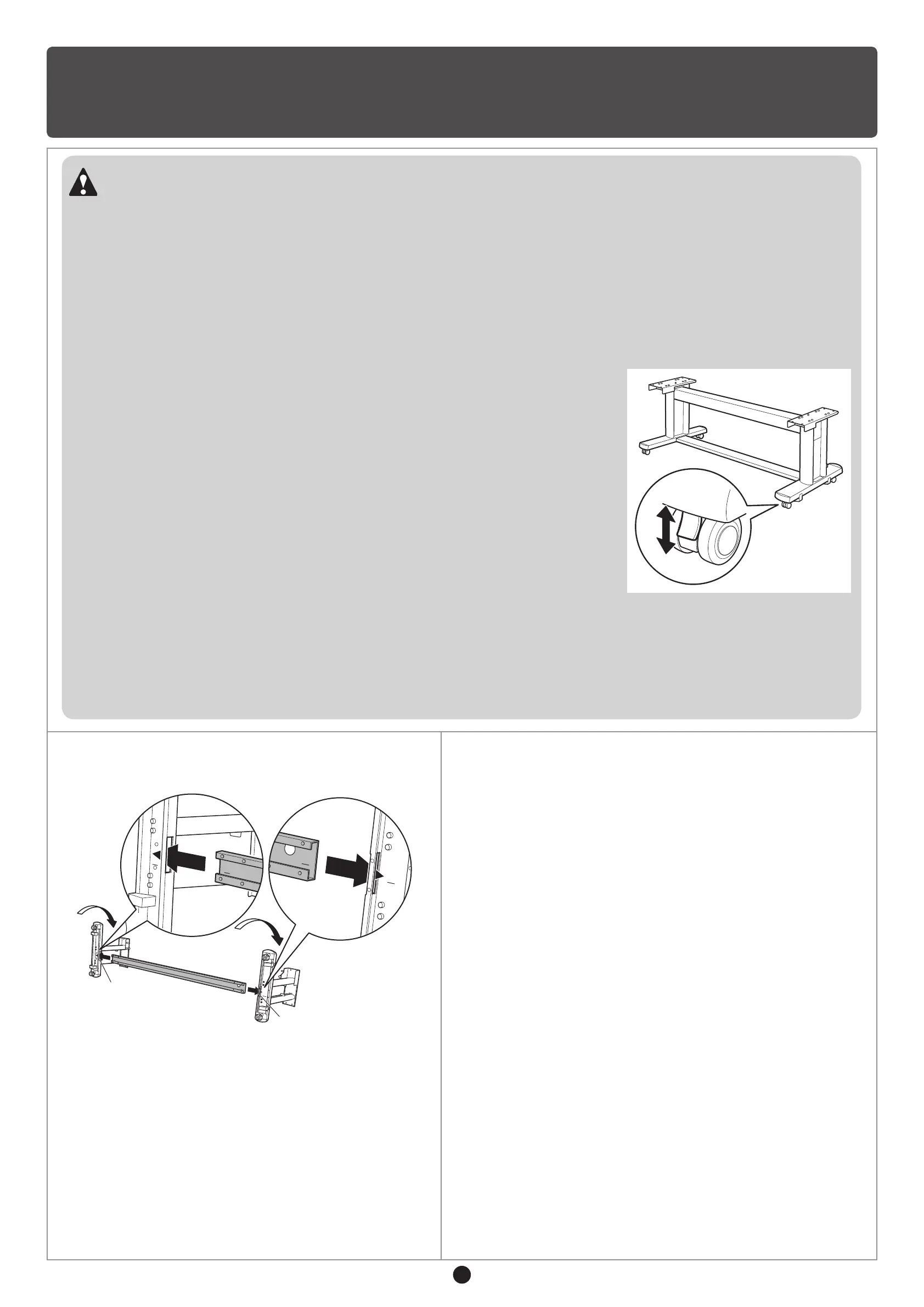 주의 [ 스탠드 ] 의 캐스터는 잠긴 상태로 공장에서 출하됩니다 . [ 스탠드 ] 의 조립이 끝날 때까지는 잠금 상태를 해제하지 마십시오 . 또한 조립한 [ 스탠드 ] 를