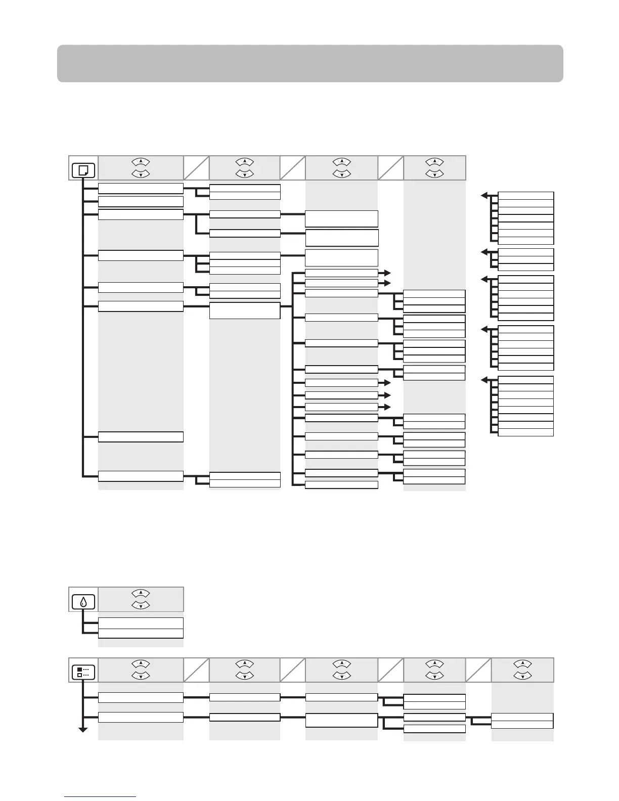 The structure of Tab Selection screen menus on the control panel is as follows. Values at right labeled with an