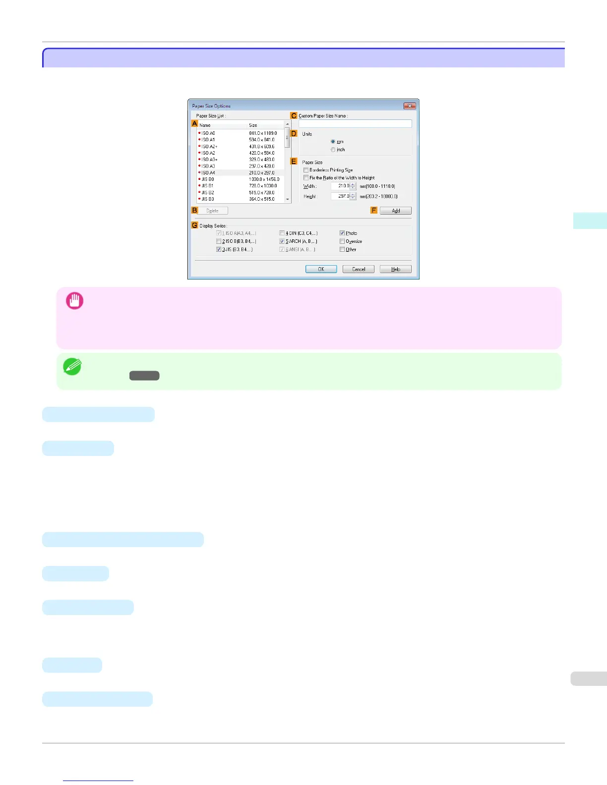 In the Paper Size Options dialog box, you can create and register your own Custom Paper Size. The sizes you define