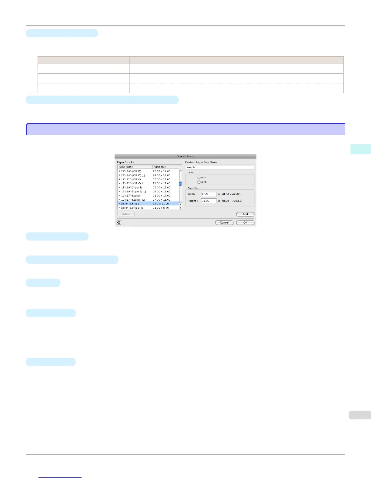 This dialog box appears when you click the Size Options button on the Page Setup Sheet. You can select a media