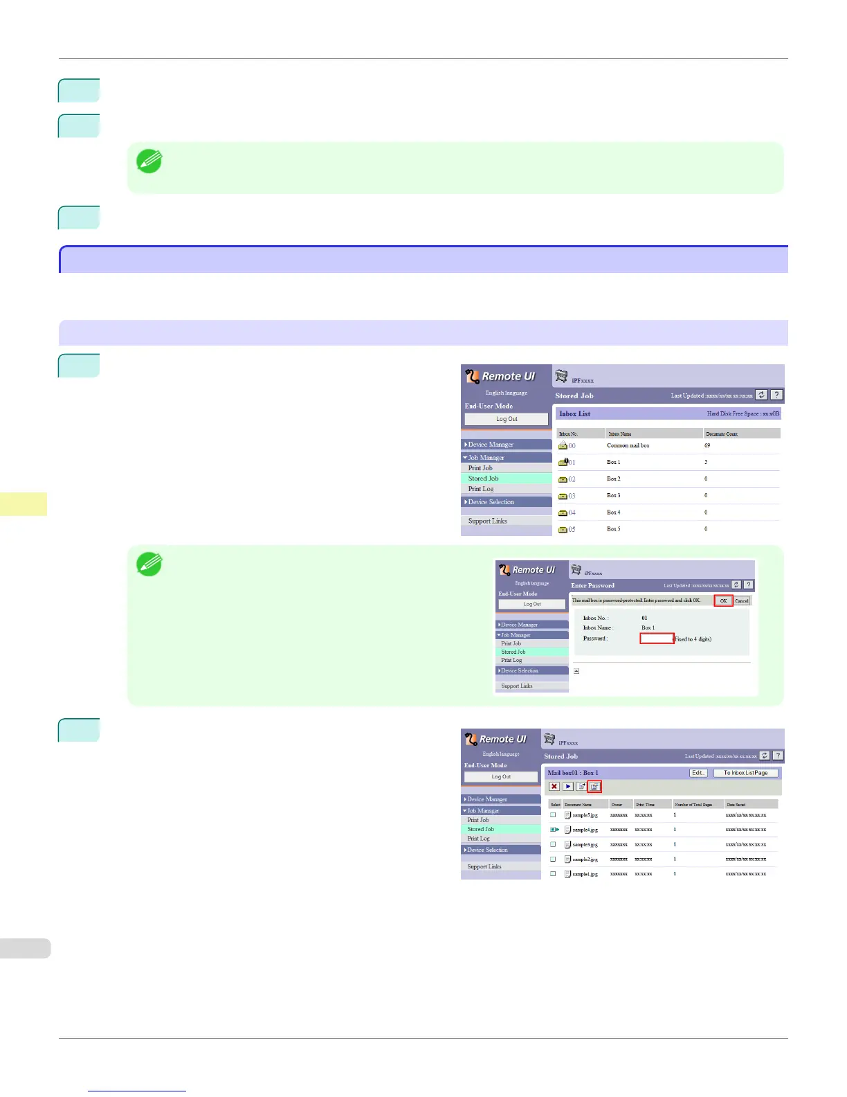 Details of print jobs stored on the printer's hard disk (saved jobs) can be displayed as follows.