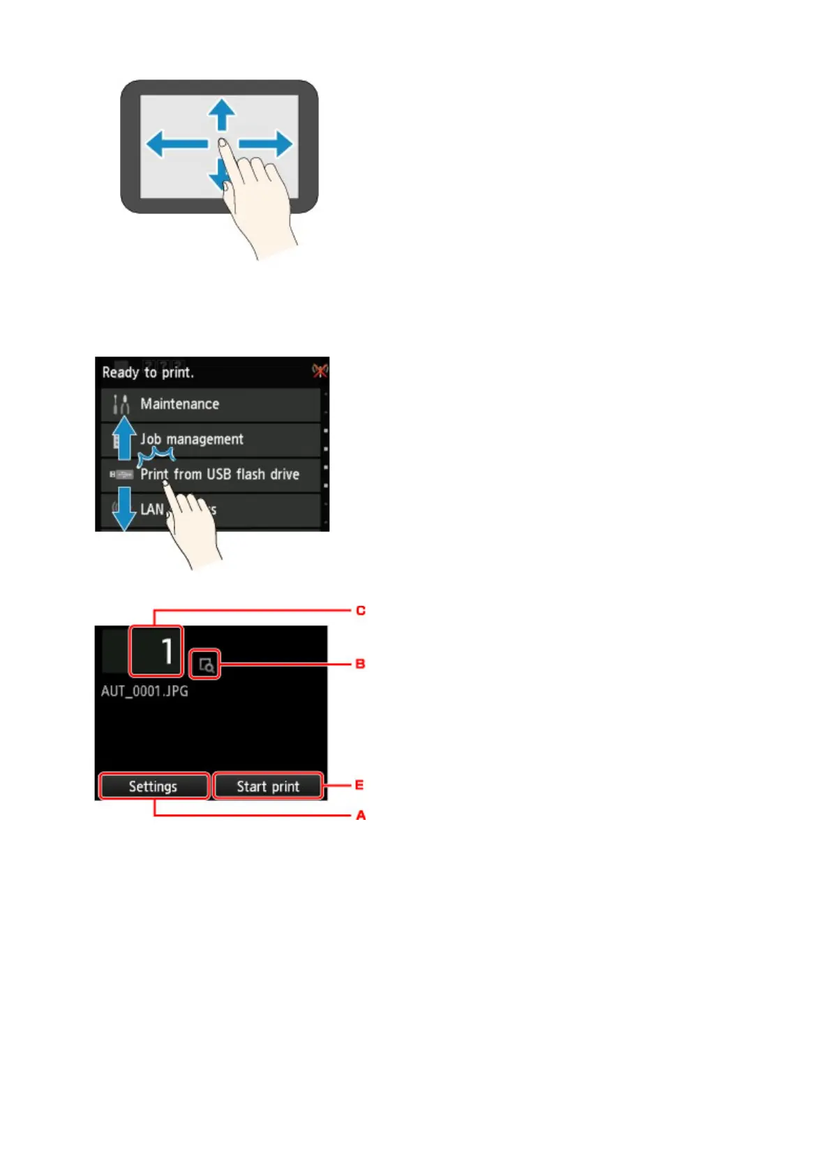These touch screen operations are available when you print data on a USB flash drive.