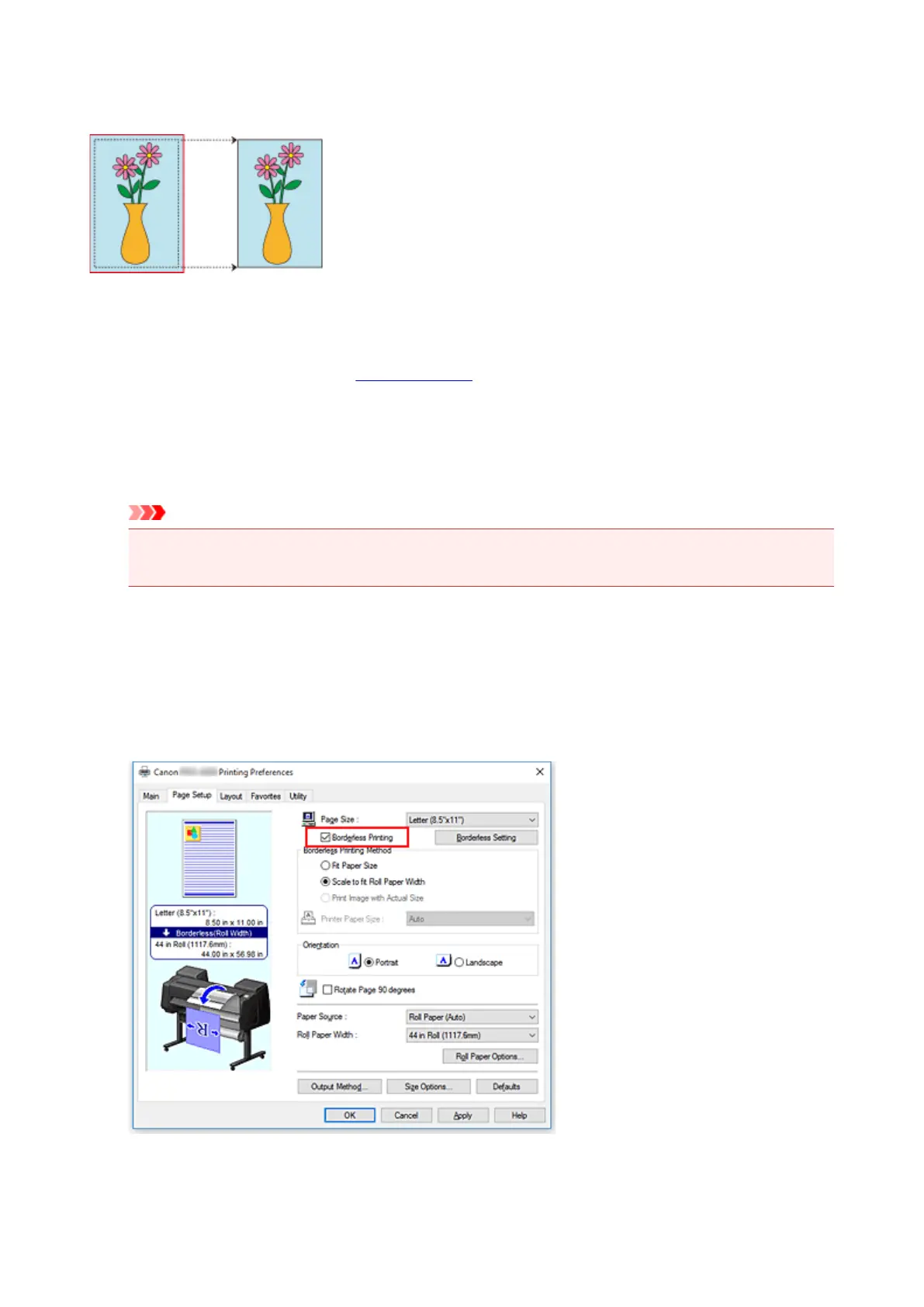 Procedure for printing borderless (without white margins around the edges) images in the same size as the