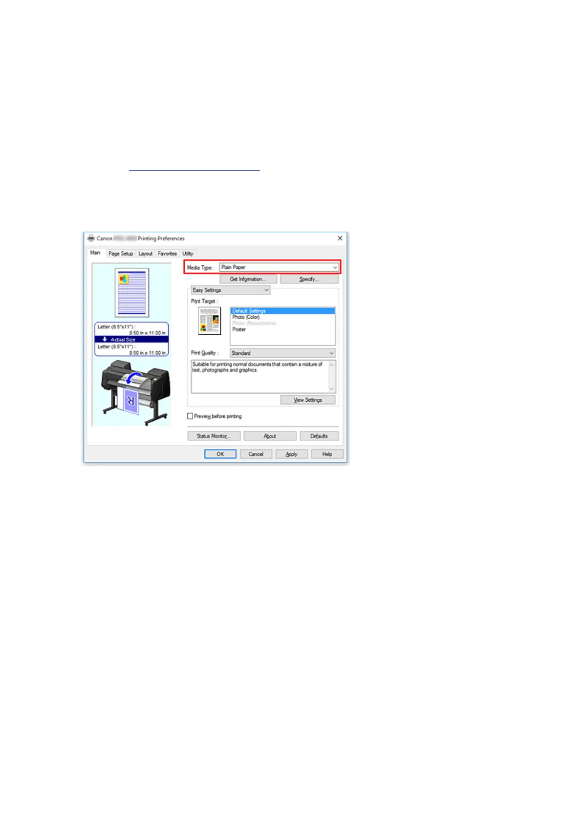 Select the type of paper loaded in the printer from the Media Type list on the Main tab.