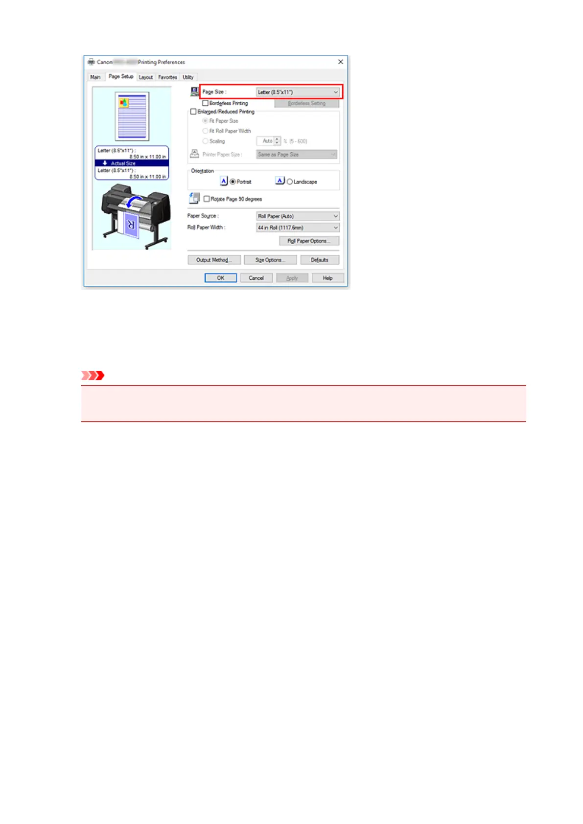 For Paper Source on the Page Setup tab, select the setting that matches your purpose from Roll Paper