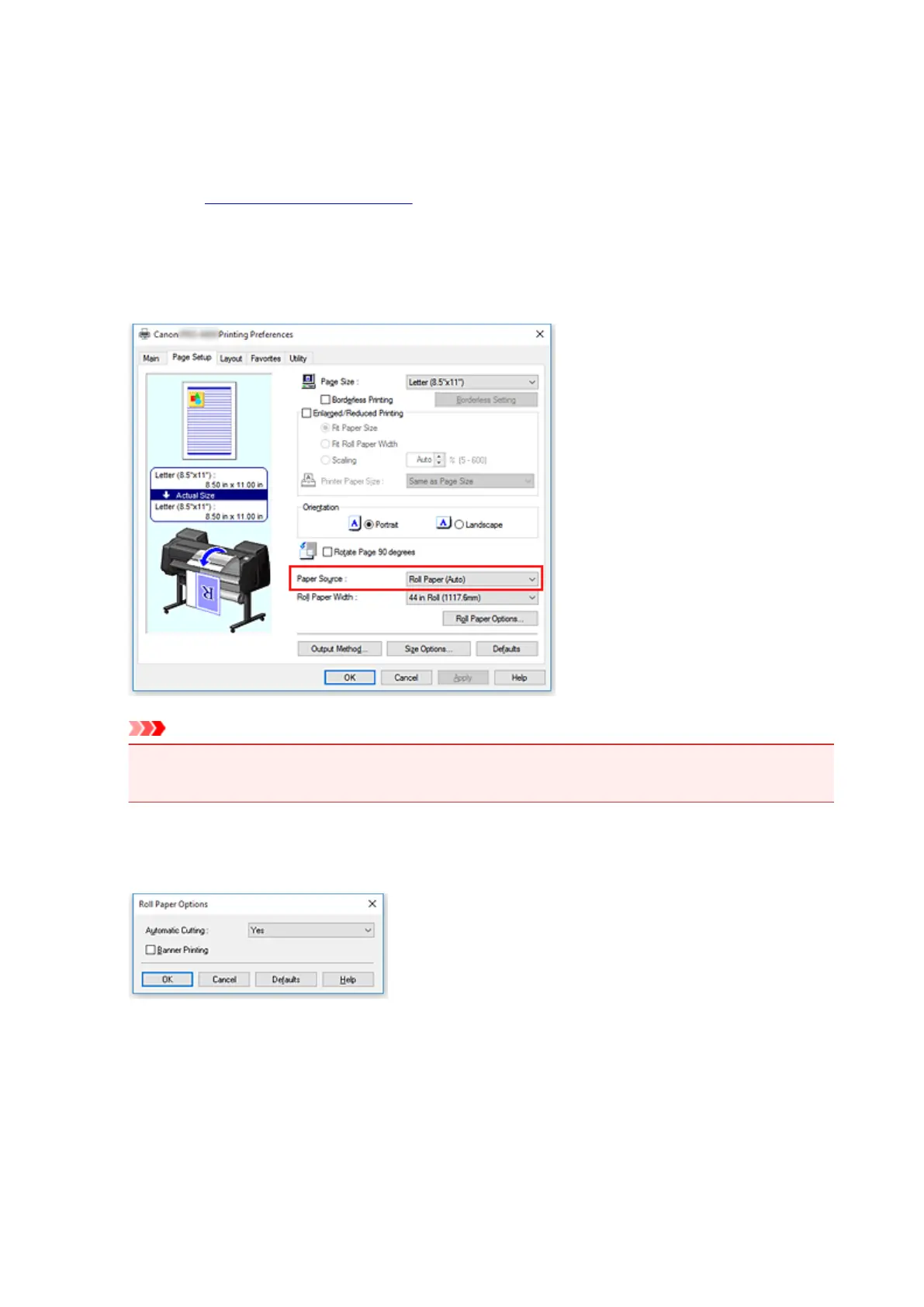 For Paper Source on the Page Setup tab, select the setting that matches your purpose from Roll Paper