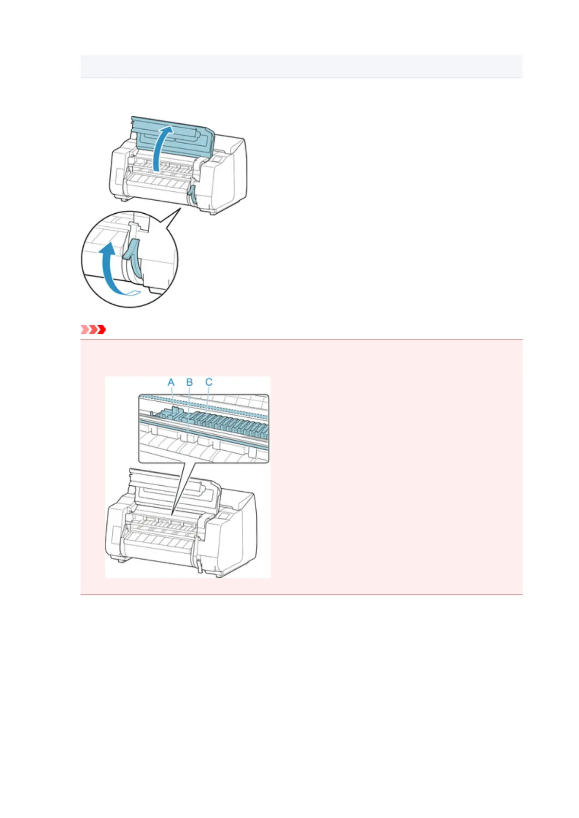 • Do not touch Linear Scale (A), carriage shaft (B), or Ink Tube Stabilizer (C). Touching these parts