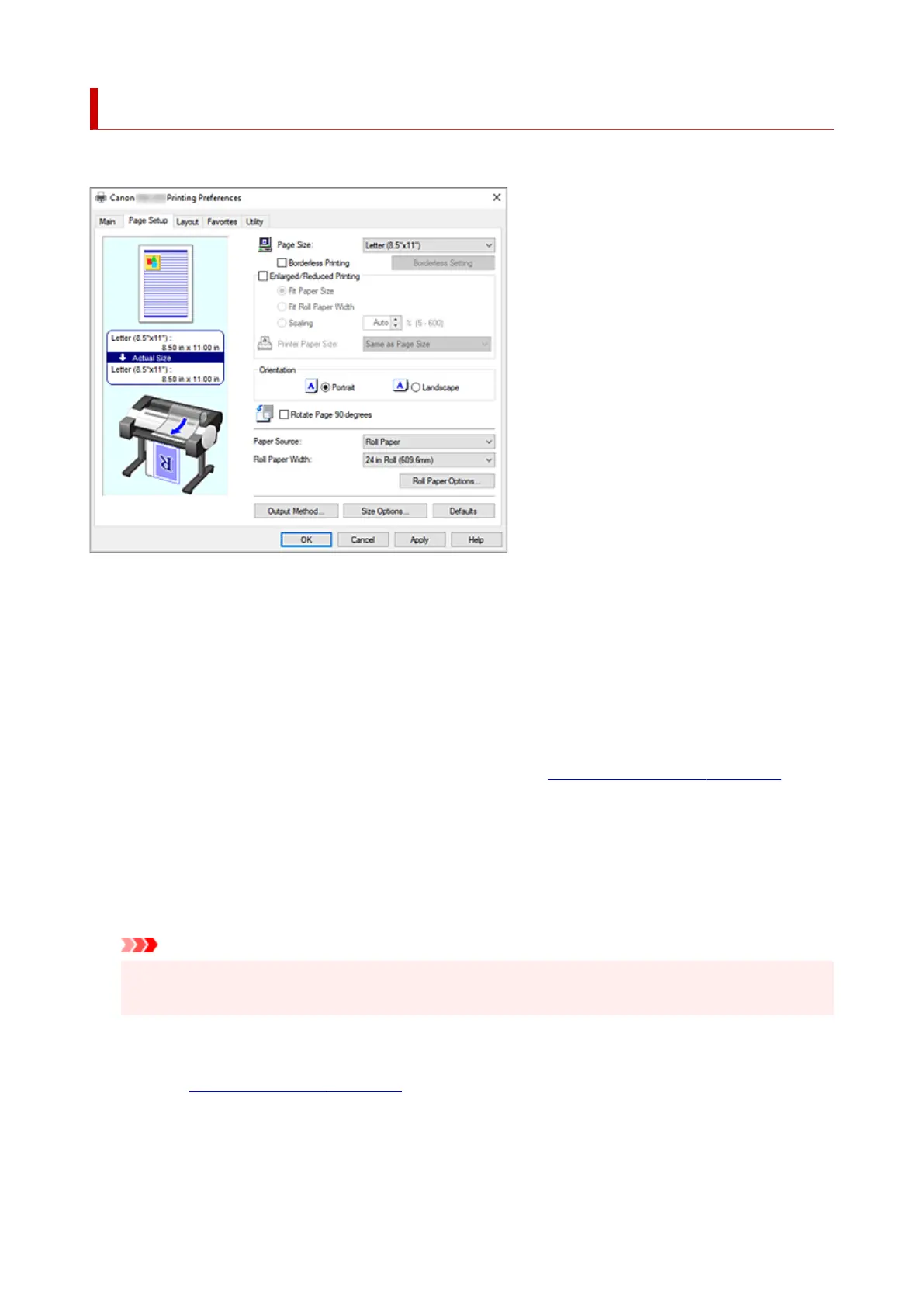 The Page Setup tab allows you to set borderless printing for a document and specify the scaling.