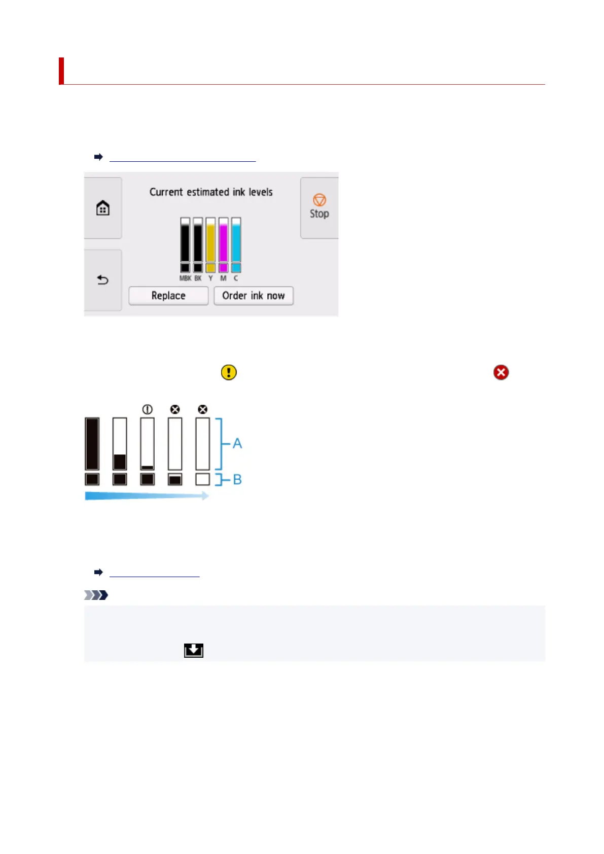 When the remaining ink is low, will appear on the remaining ink level. When ink runs out, will