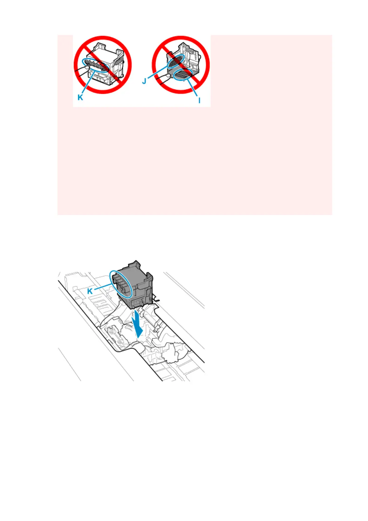 with the nozzles and metal contacts facing down. If the nozzles or metal contacts are damaged,