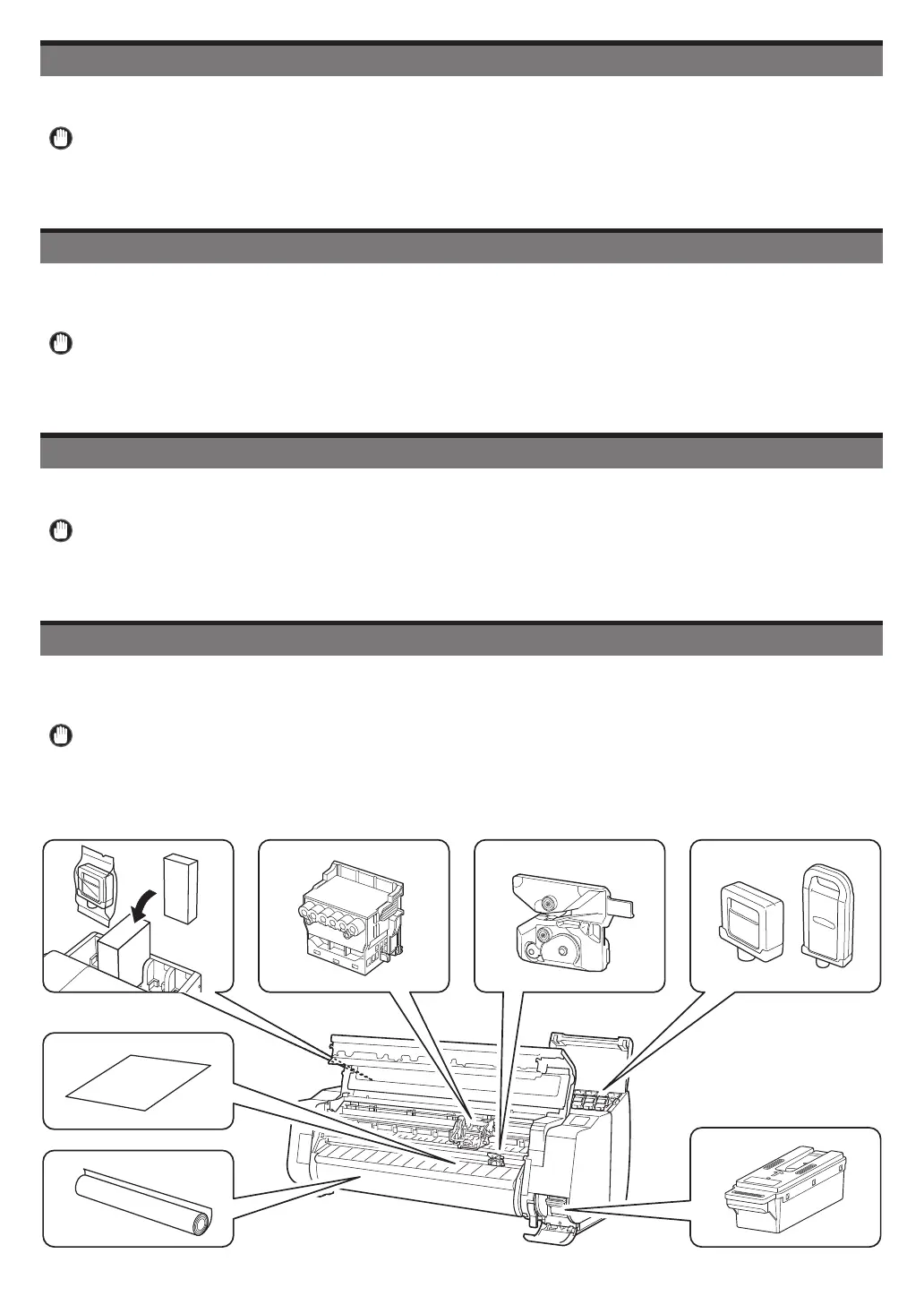 A : Roll paper B : Cut sheet C : Ink tank D : Print head E : Cutter blade F : Maintenance cartridge