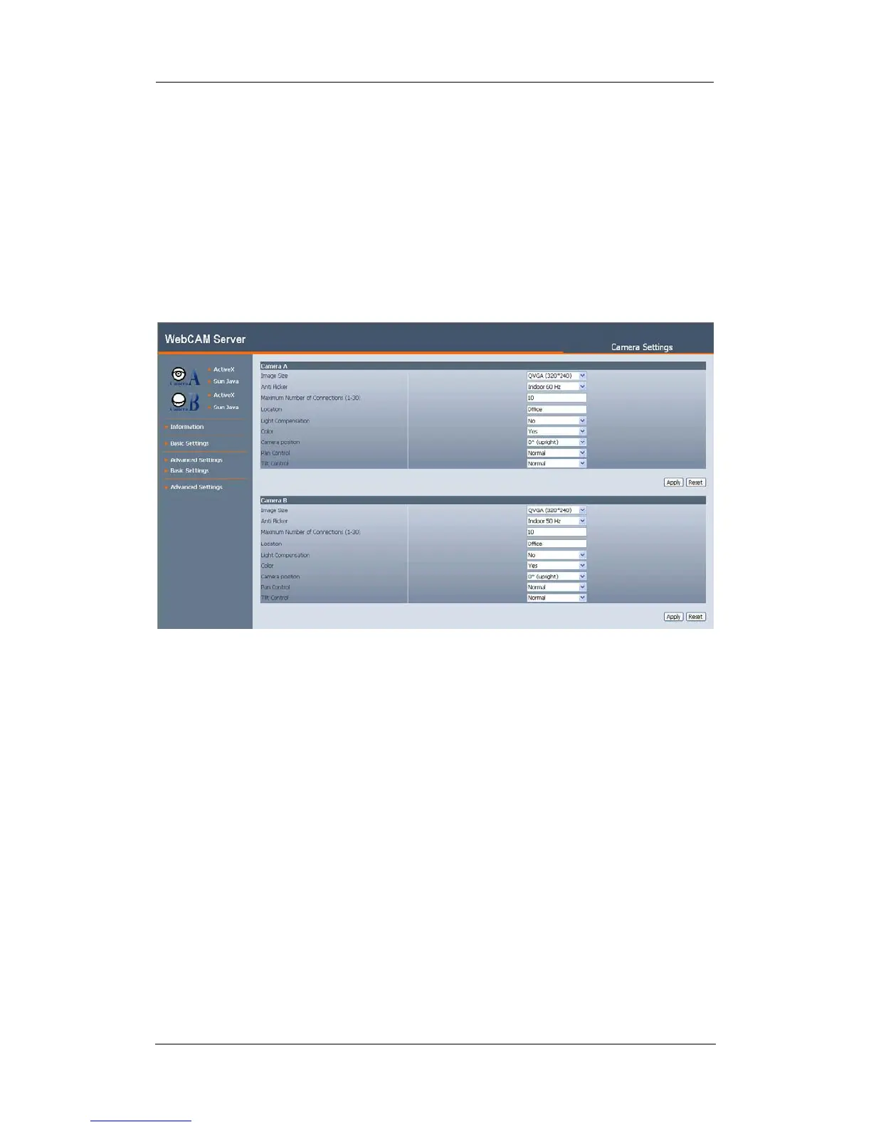 The WebCAM webpage main menu is divided into two sections. The selection menu