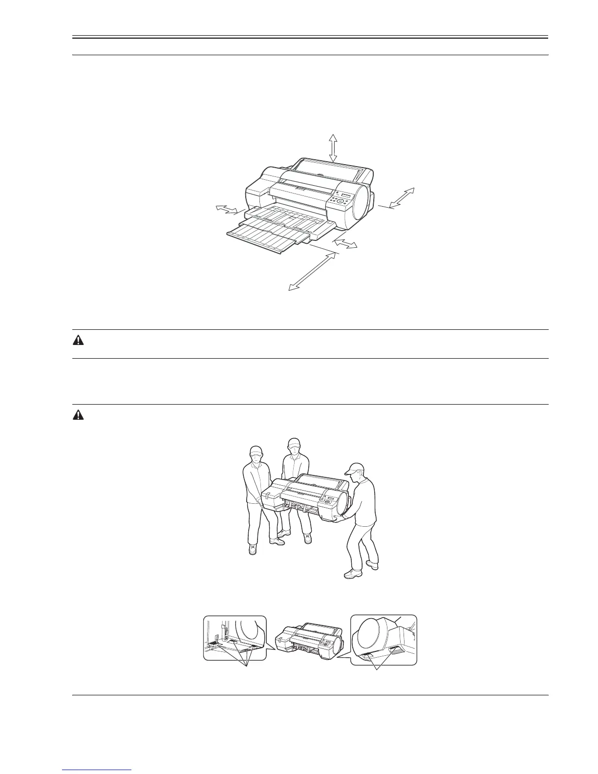 The printer must be moved with it held by three or more persons on both sides. Be careful not to get your lower back and other regions hurt.