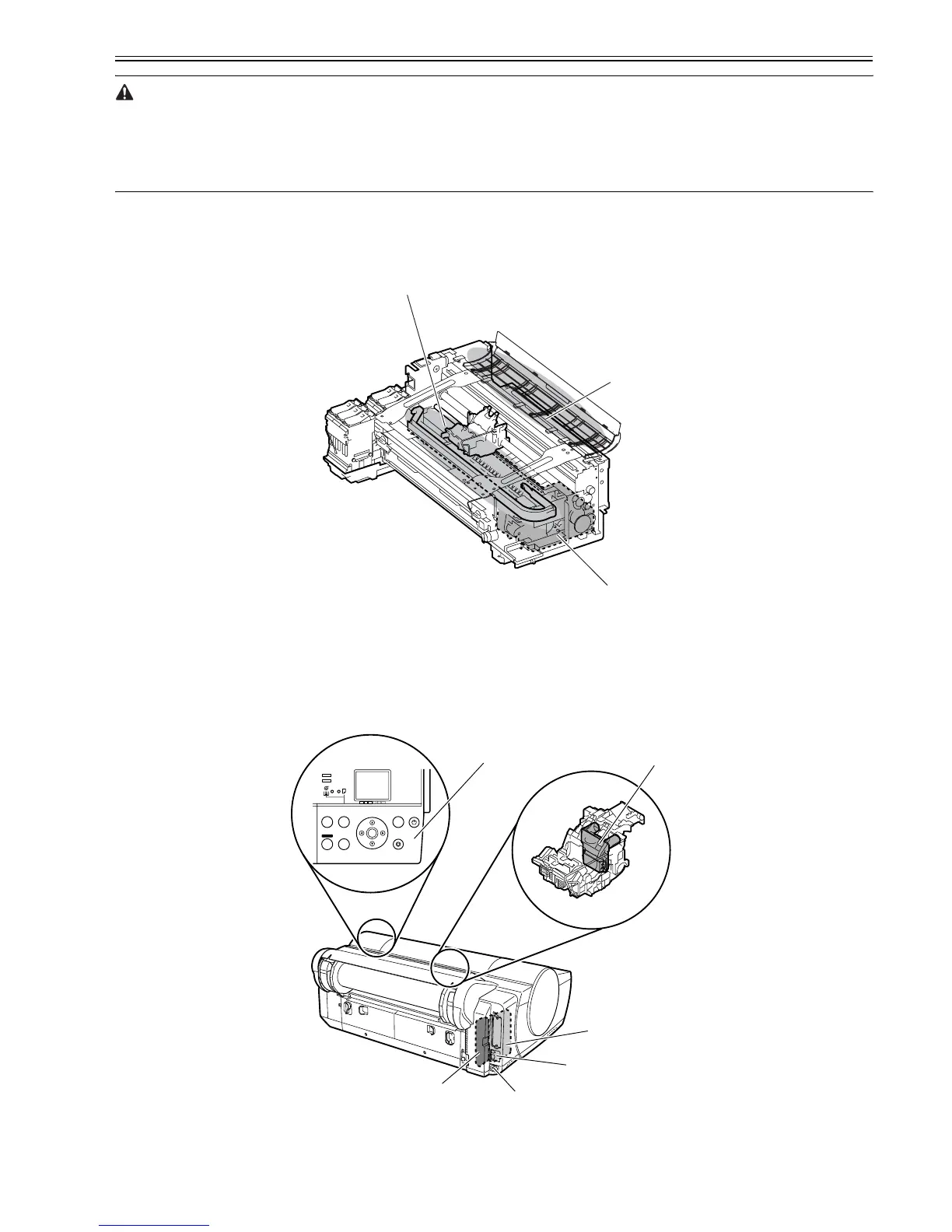 When serving the printer with the cover removed, be extremely careful to avoid electric shock and shorting electrical devices.