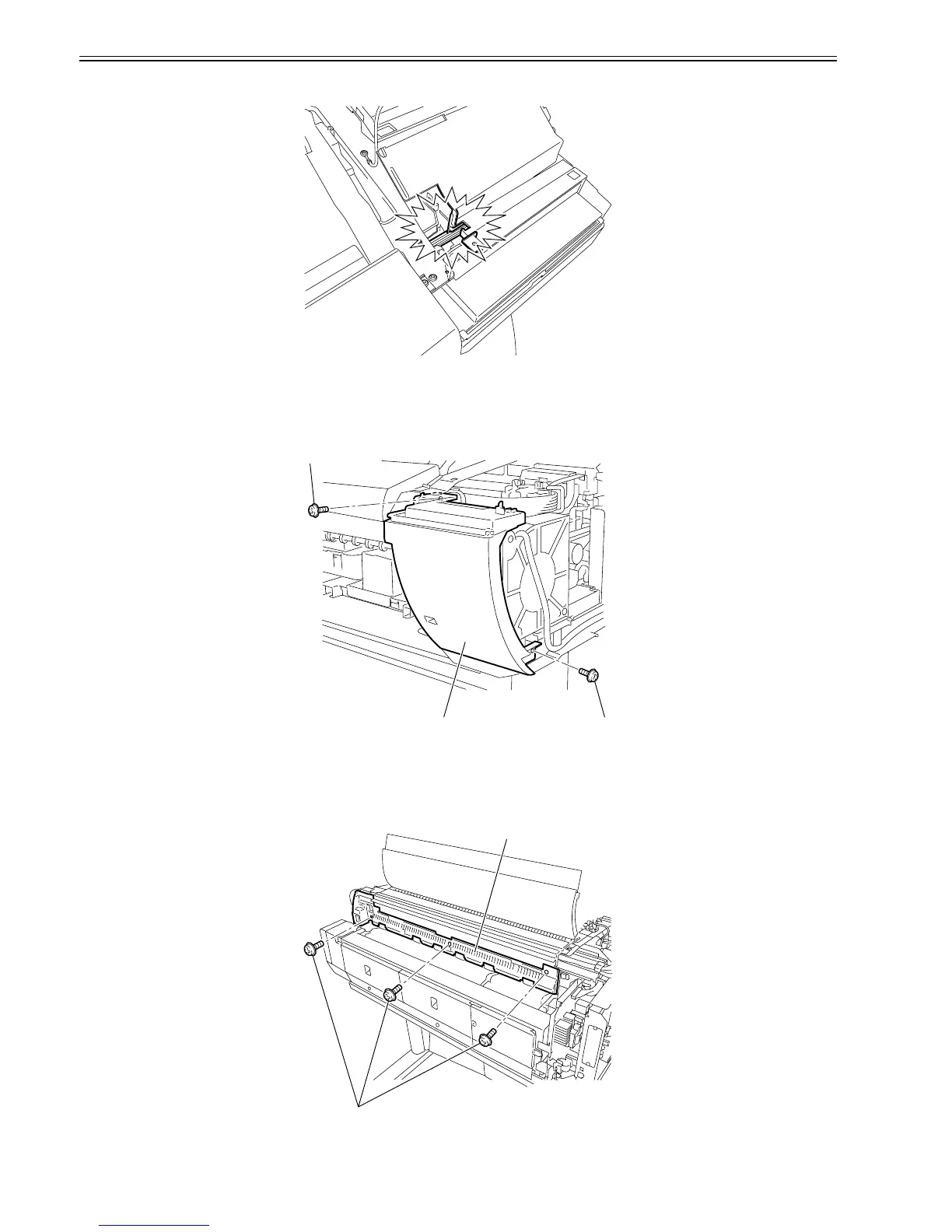1) When removing the right front cover[2], open the top cover, and then remove the roll feed unit, output guide, right circle cover, operation panel, exhaust filter,