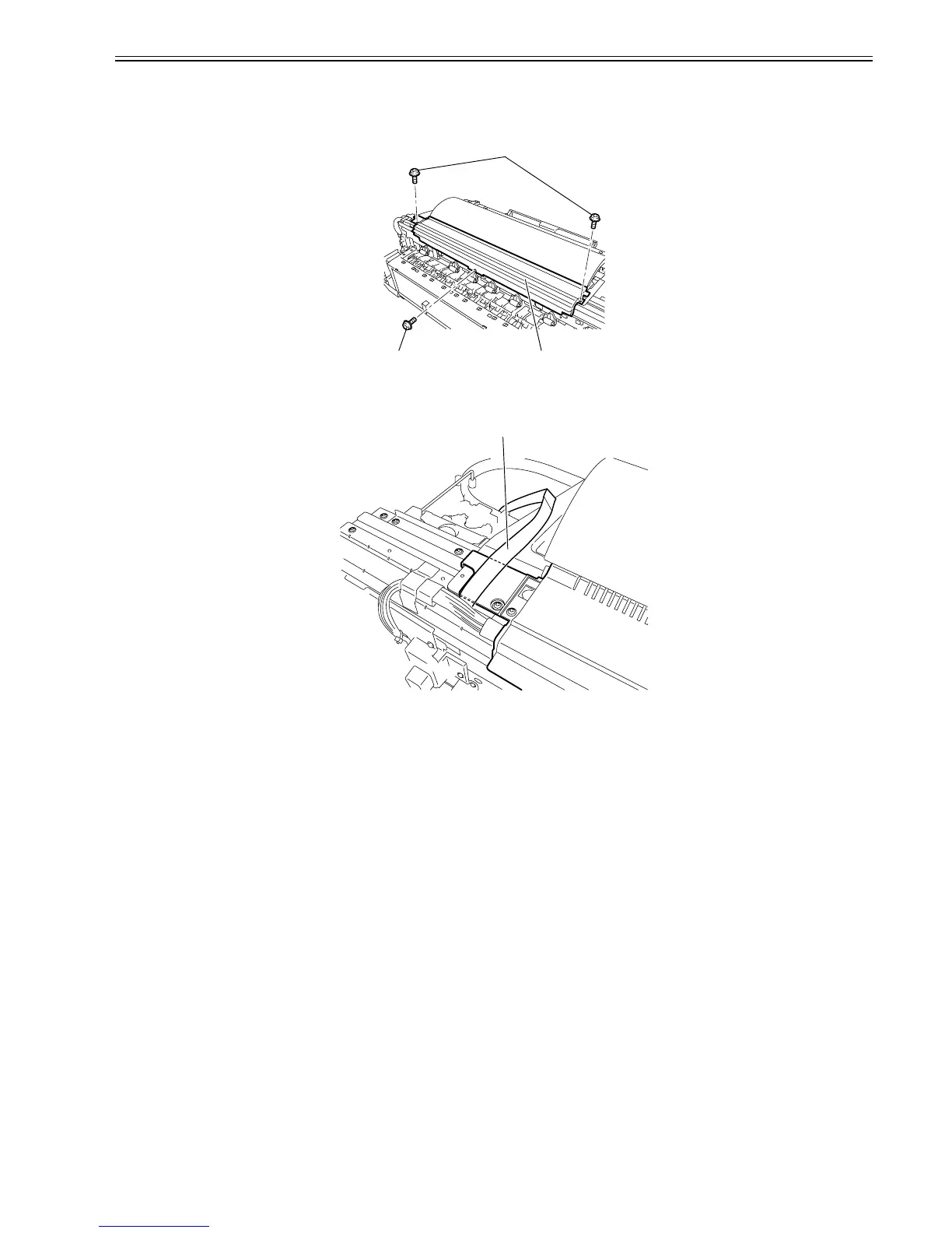 In attaching the upper rear cover, allow flexible cable[1] in the control area to pass over the cover.