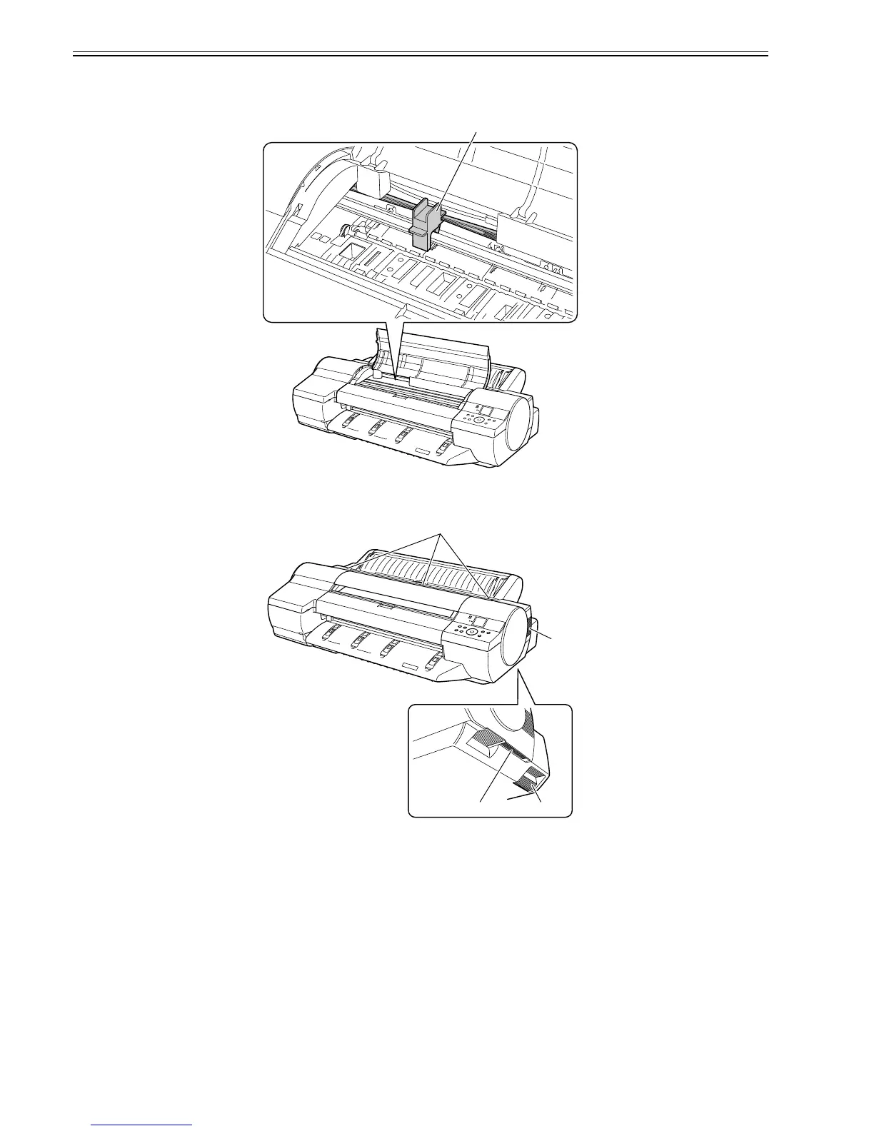 Before transporting the printer, secure the carriage at its home position using belt stoppers[1] so that the carriage does not become separated from the lock arm and