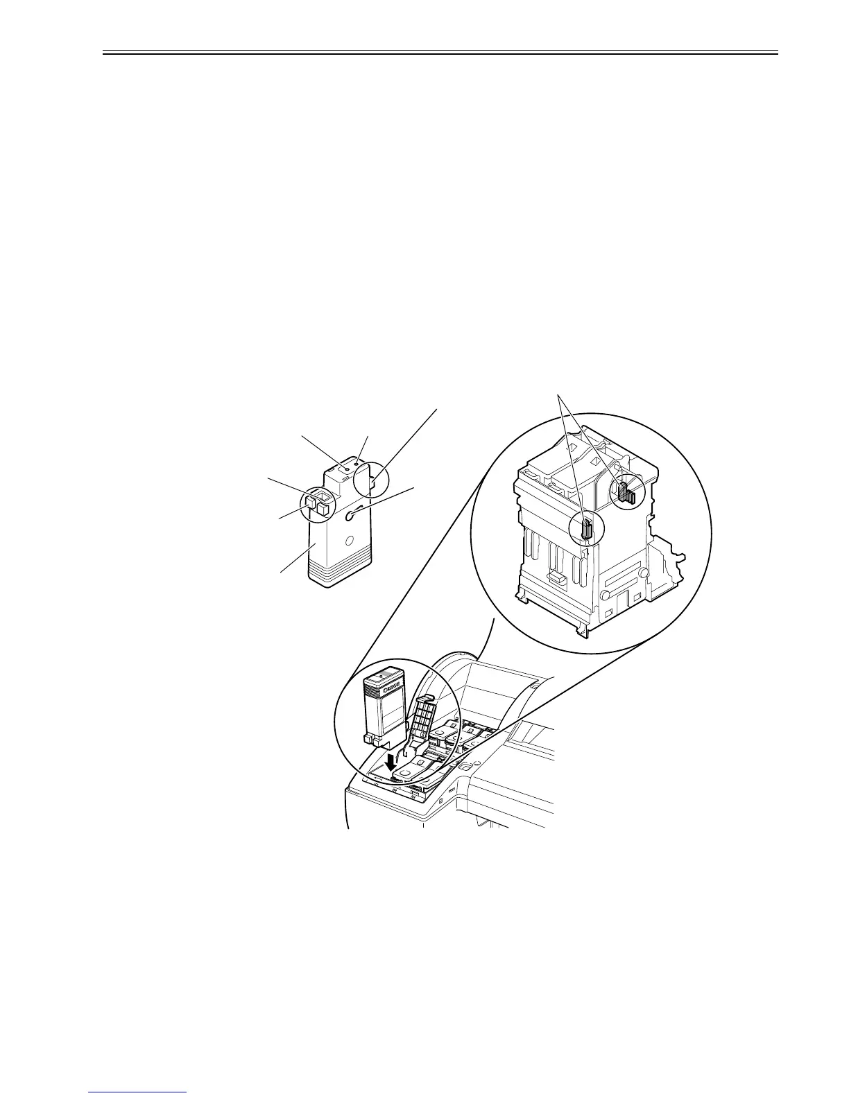 When the ink tank lock lever is pressed down, the hollow needle enters the ink port (covered with a rubber plug), establishing an ink passage between the printer