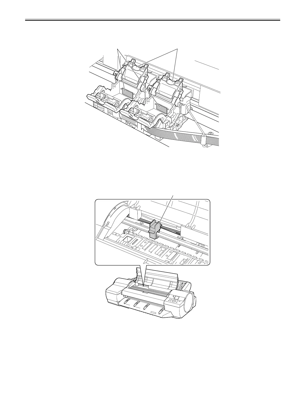 Before transporting the printer, secure the carriage at its home position using belt stoppers[1] so that the carriage does not become separated from the lock arm and