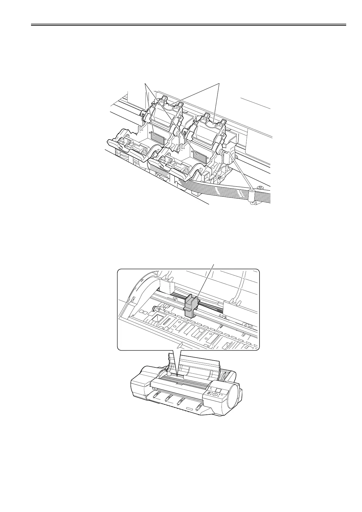 Before transporting the printer, secure the carriage at its home position using belt stoppers[1] so that the carriage does not become separated from the lock arm and