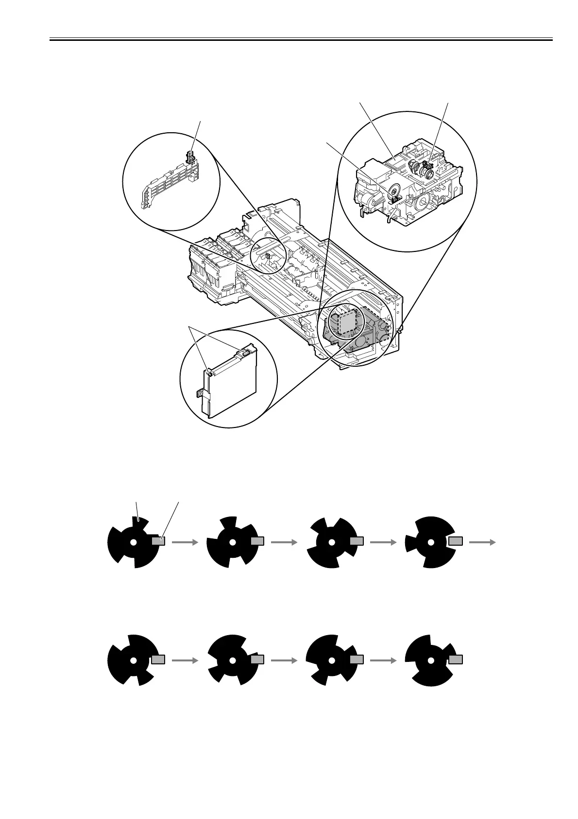 The photo-interrupter-type pump cam sensor detects that the sensor light is shielded or unshielded by the rotary cam. The sensor detects the purge unit capping and