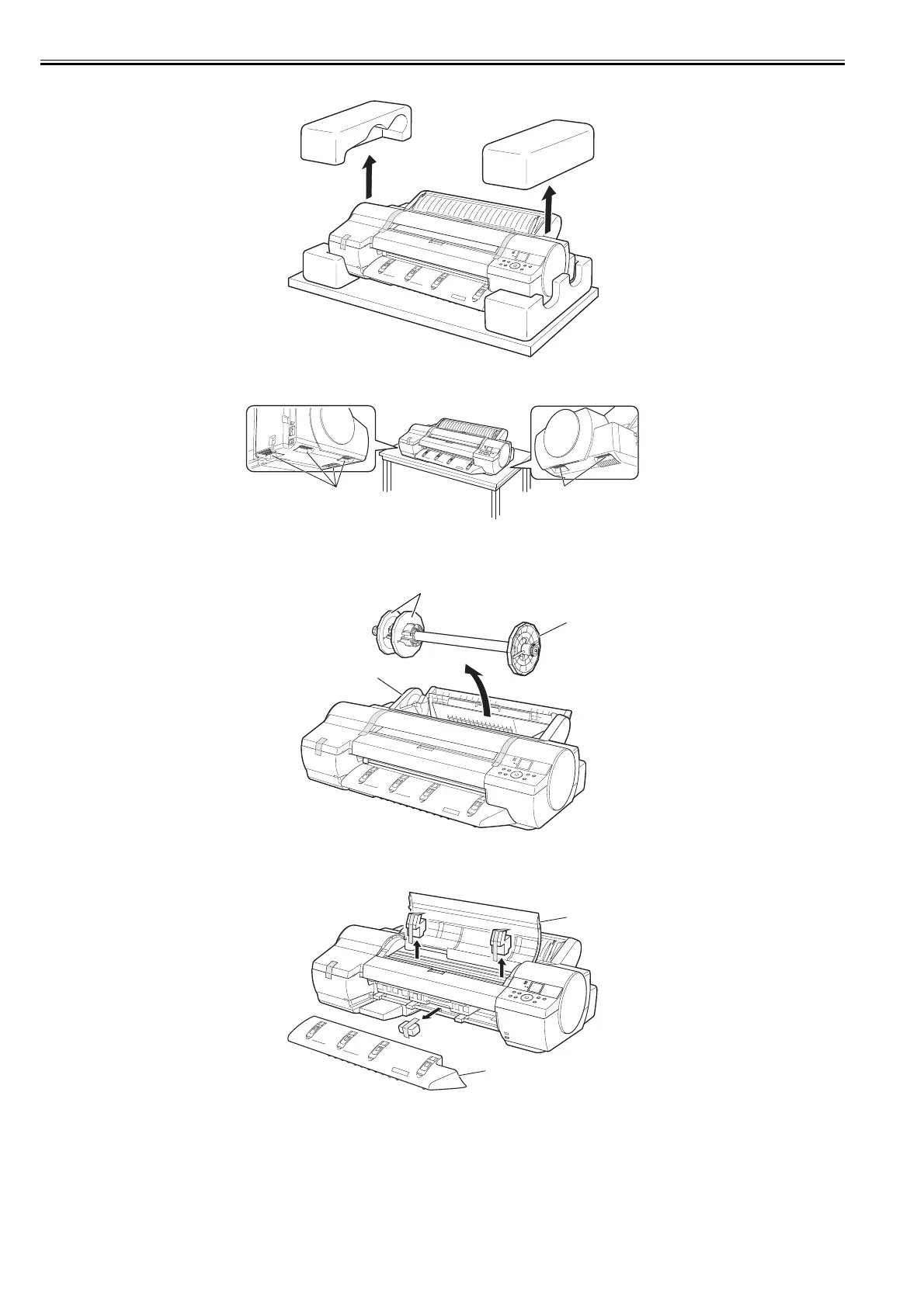 (5) Remove the tape and other packaging material used to secure the printer and accessories. Remove the tape and protective material on the Top Cover [1] and