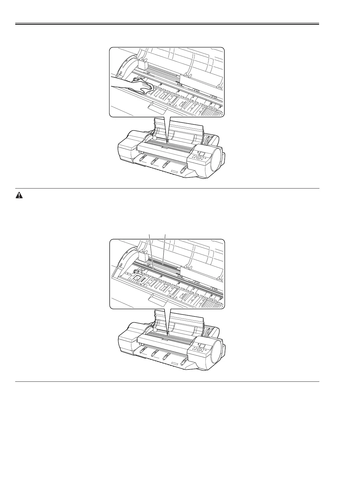 8) Wipe off dirt inside the top cover with a cloth moistened with water and then wrung tight. Wipe off ink smears from the entire surface of the platen, the pinch