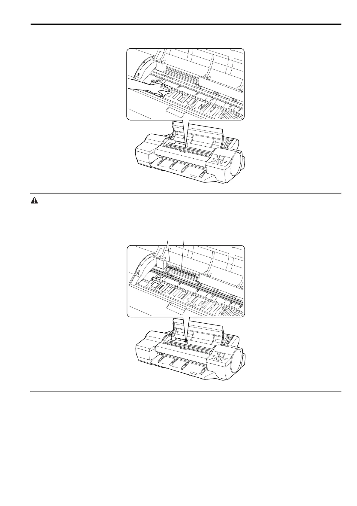 8) Wipe off dirt inside the top cover with a cloth moistened with water and then wrung tight. Wipe off ink smears from the entire surface of the platen, the pinch