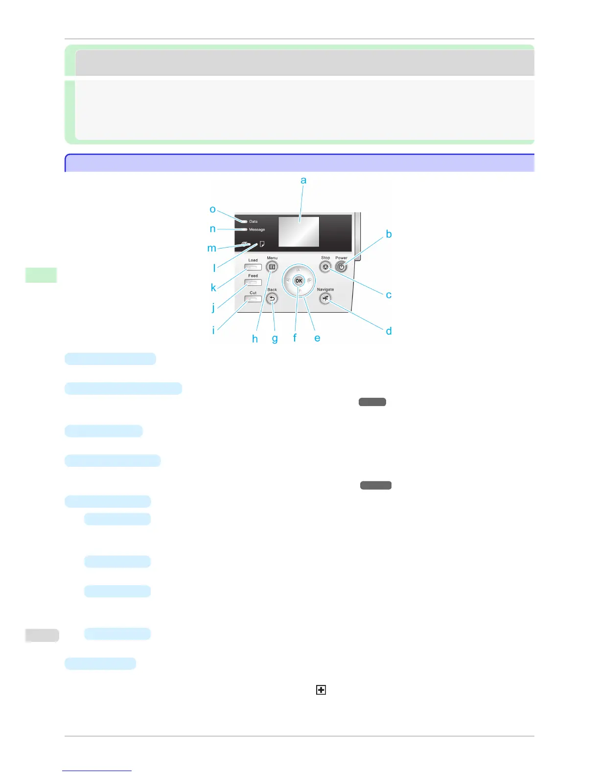 Shows printer menus, as well as the printer status and messages.