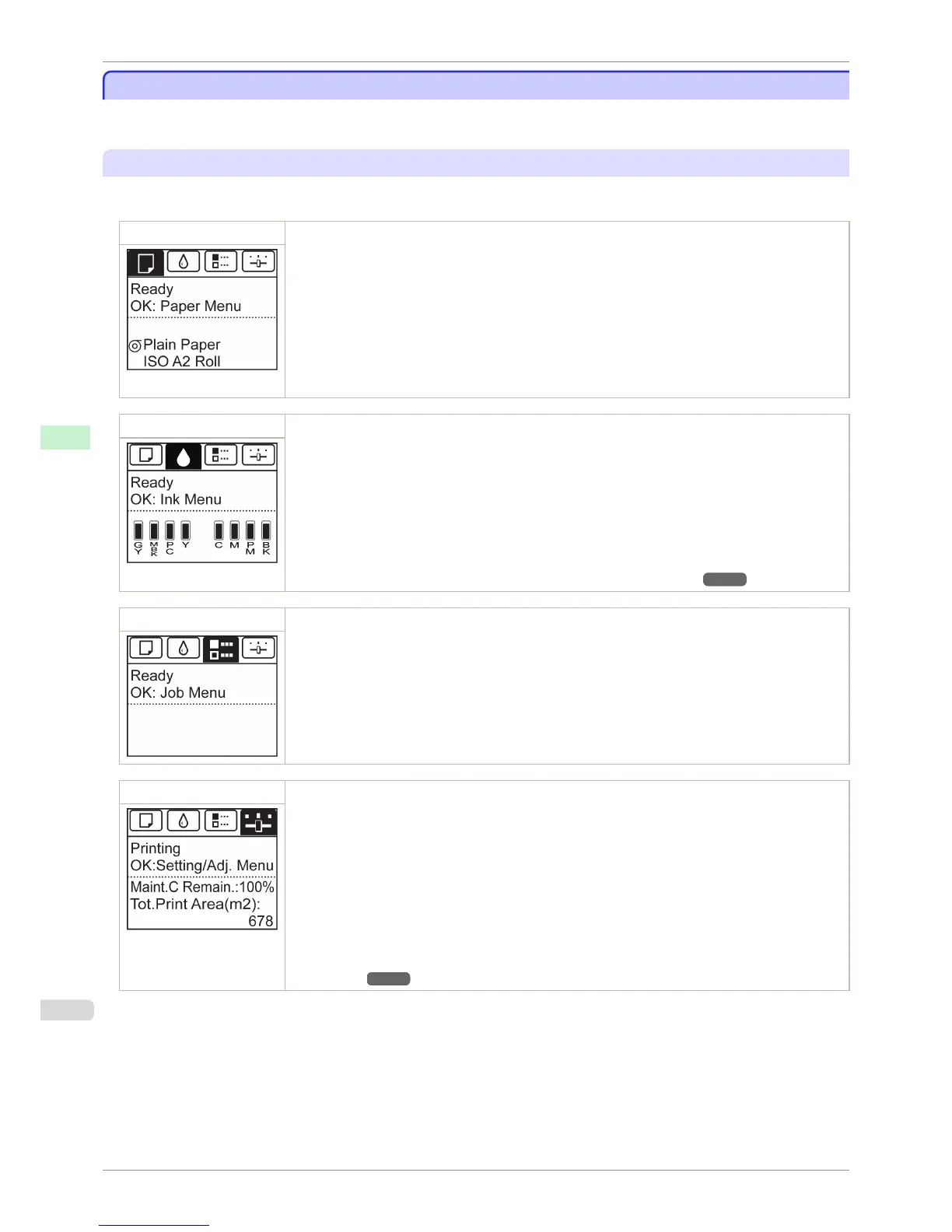 Ink tab A tab indicating status and showing menus related to ink. Pressing the OK button when this tab is highligh-