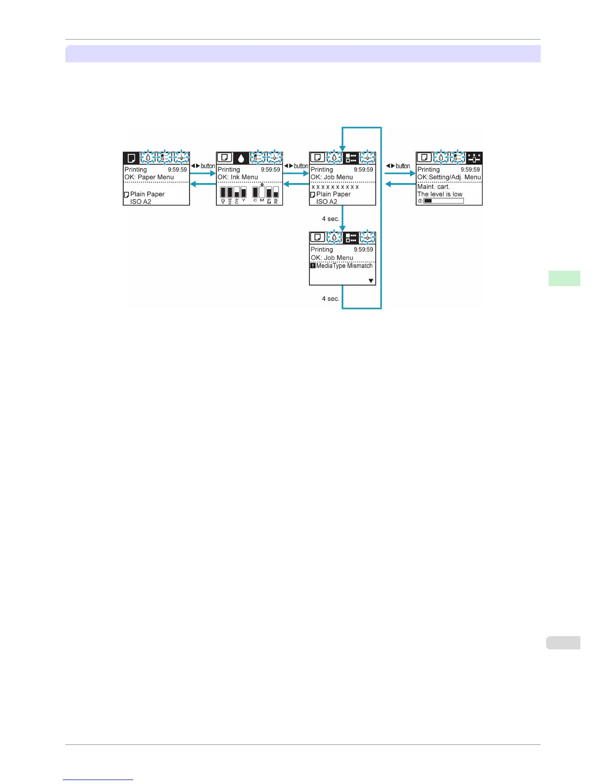 The display transitions while an error has occurred on the printer are shown below.